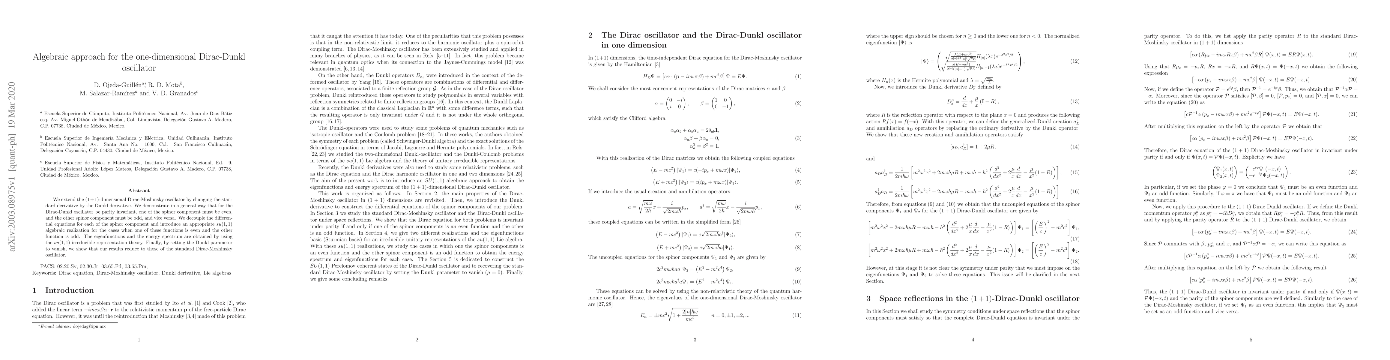 This paper extends the $(1+1)$-dimensional Dirac-Moshinsky oscillator using the Dunkl derivative, demonstrating parity invariance requires opposite-parity spinor components. It employs $su(1,1)$ algebra to decouple and solve the differential equations, obtaining eigenfunctions and energy spectra via irreducible representation theory, and shows results revert to the standard Dirac-Moshinsky oscillator when the Dunkl parameter is zero.