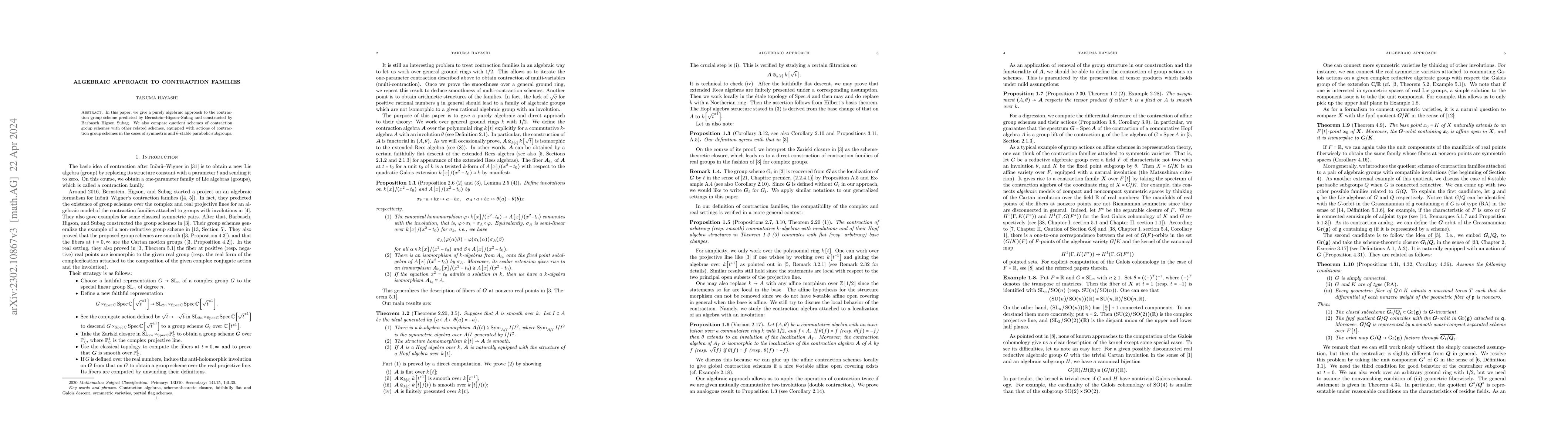 In this paper, we give a purely algebraic approach to the contraction group scheme predicted by Bernstein--Higson--Subag and constructed by Barbasch--Higson--Subag. We also compare quotient schemes of contraction group schemes with other related schemes, equipped with actions of contraction group schemes in the cases of symmetric and $\theta$-stable parabolic subgroups.