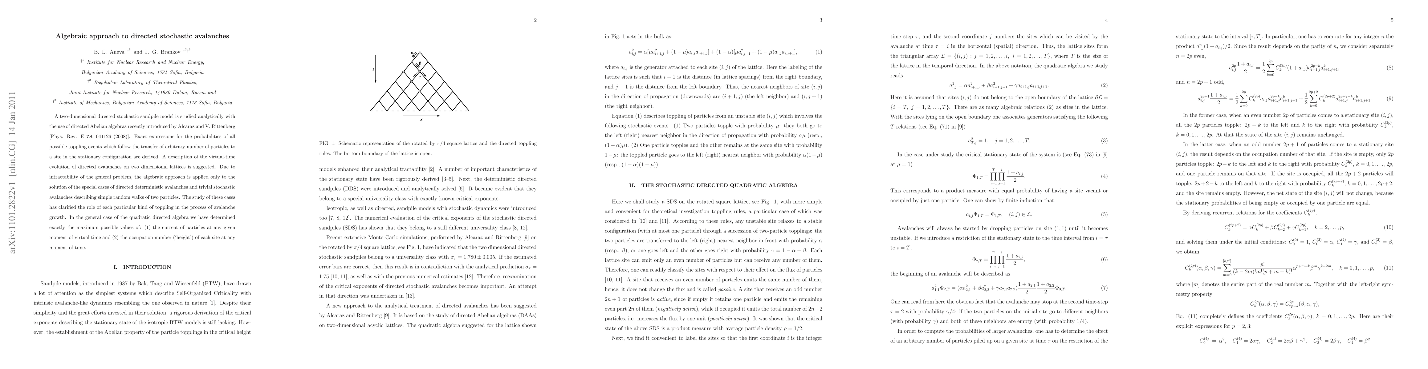 A two-dimensional directed stochastic sandpile model is studied analytically with the use of directed Abelian algebras recently introduced by Alcaraz and V. Rittenberg [Phys. Rev. E {\bf 78}, 041126 (2008)]. Exact expressions for the probabilities of all possible toppling events which follow the transfer of arbitrary number of particles to a site in the stationary configuration are derived. A description of the virtual-time evolution of directed avalanches on two dimensional lattices is suggested. Due to intractability of the general problem, the algebraic approach is applied only to the solution of the special cases of directed deterministic avalanches and trivial stochastic avalanches describing simple random walks of two particles. The study of these cases has clarified the role of each particular kind of toppling in the process of avalanche growth. In the general case of the quadratic directed algebra we have determined exactly the maximum possible values of: (1) the current of particles at any given moment of virtual time and (2) the occupation number (`height') of each site at any moment of time.