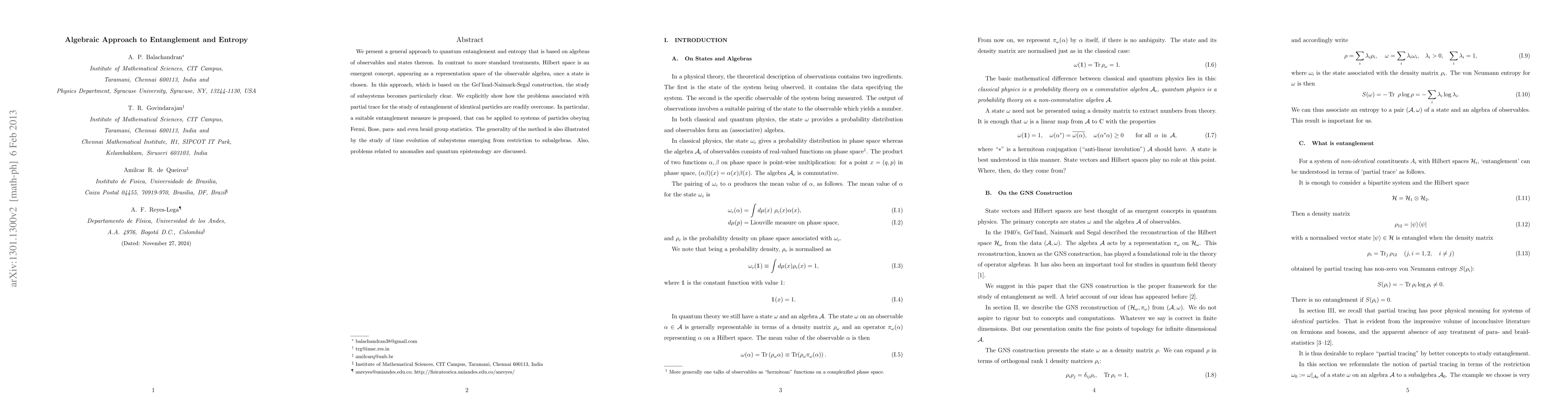 We present a general approach to quantum entanglement and entropy that is based on algebras of observables and states thereon. In contrast to more standard treatments, Hilbert space is an emergent concept, appearing as a representation space of the observable algebra, once a state is chosen. In this approach, which is based on the Gelfand-Naimark-Segal construction, the study of subsystems becomes particularly clear. We explicitly show how the problems associated with partial trace for the study of entanglement of identical particles are readily overcome. In particular, a suitable entanglement measure is proposed, that can be applied to systems of particles obeying Fermi, Bose, para- and even braid group statistics. The generality of the method is also illustrated by the study of time evolution of subsystems emerging from restriction to subalgebras. Also, problems related to anomalies and quantum epistemology are discussed.