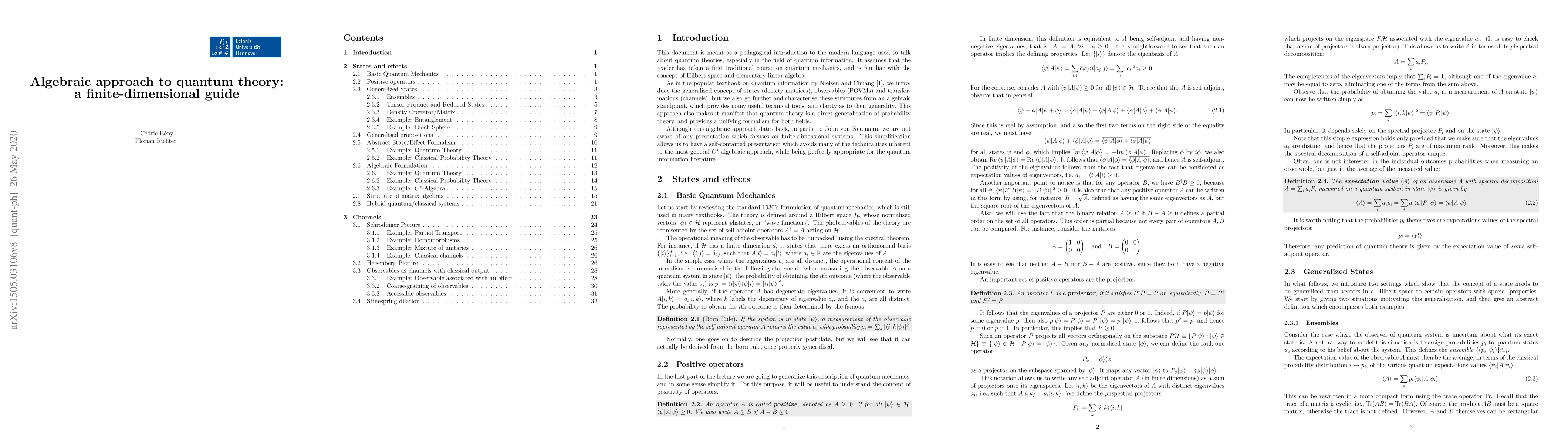 This paper introduces an algebraic approach to quantum theory, providing a finite-dimensional guide that generalises probability theory and offers a unifying formalism for both fields.
