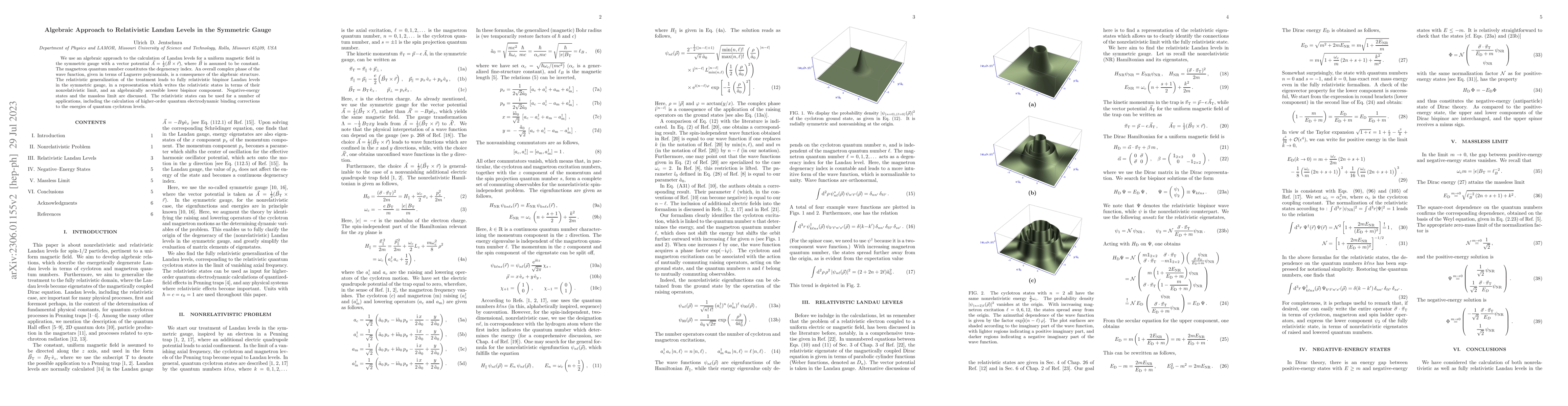 We use an algebraic approach to the calculation of Landau levels for a uniform magnetic field in the symmetric gauge with a vector potential A = (1/2) (B x r), where B is assumed to be constant. The magnetron quantum number constitutes the degeneracy index. An overall complex phase of the wave function, given in terms of Laguerre polynomials, is a consequence of the algebraic structure. The relativistic generalization of the treatment leads to fully relativistic bispinor Landau levels in the symmetric gauge, in a representation which writes the relativistic states in terms of their nonrelativistic limit, and an algebraically accessible lower bispinor component. Negative-energy states and the massless limit are discussed. The relativistic states can be used for a number of applications, including the calculation of higher-order quantum electrodynamic binding corrections to the energies of quantum cyclotron levels.