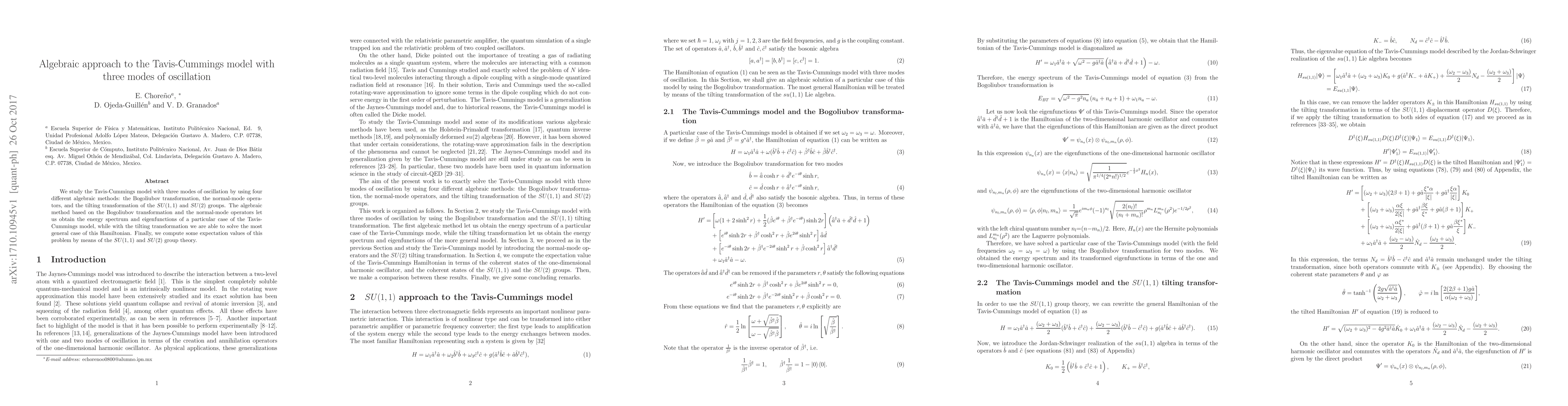 Researchers used algebraic methods to study the Tavis-Cummings model with three modes of oscillation, solving for energy spectra and eigenfunctions using some cases, and deriving general solutions using group theory transformations.