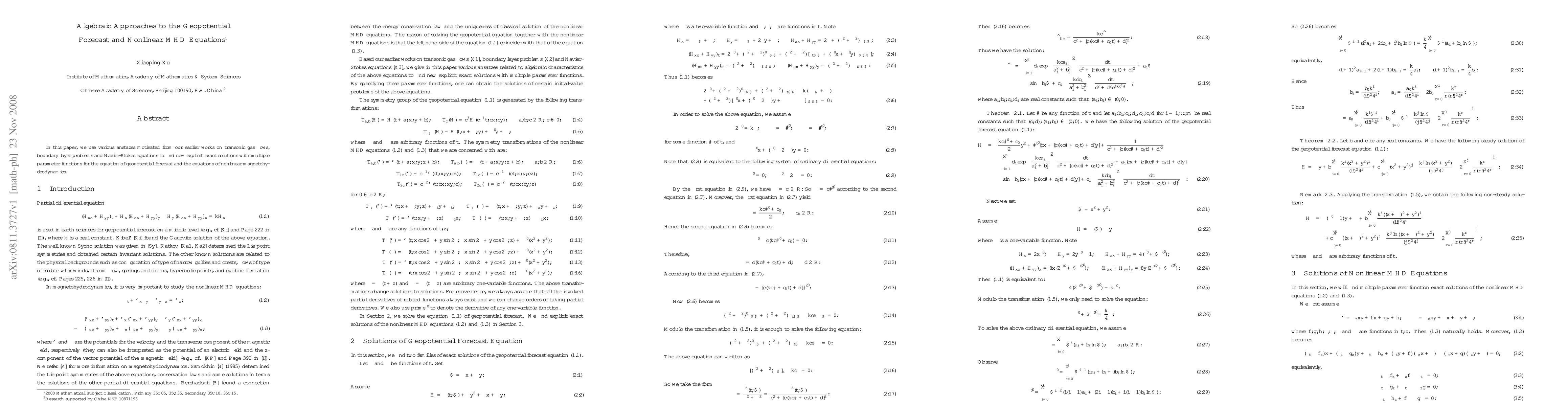 Summary: This research develops algebraic methods inspired by previous studies on fluid dynamics to derive explicit exact solutions for geopotential forecast and nonlinear magnetohydrodynamics equations, utilizing multiple parameter functions.