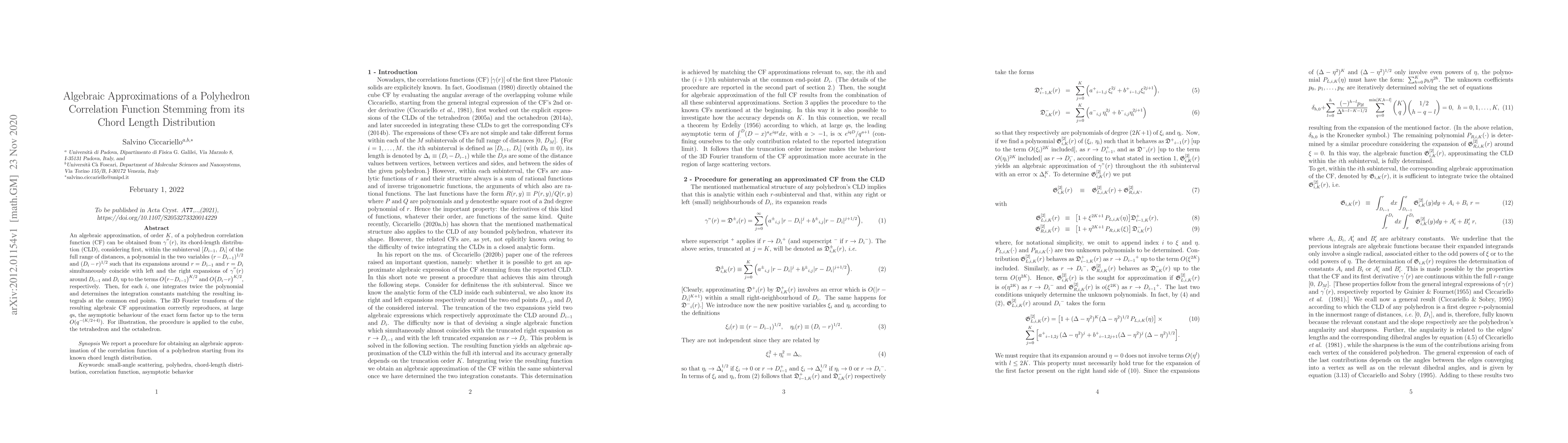 An algebraic approximation, of order $K$, of a polyhedron correlation function (CF) can be obtained from $\gamma\pp(r)$, its chord-length distribution (CLD), considering first, within the subinterval $[D_{i-1},\, D_i]$ of the full range of distances, a polynomial in the two variables $(r-D_{i-1})^{1/2}$ and $(D_{i}-r)^{1/2}$ such that its expansions around $r=D_{i-1}$ and $r=D_i$ simultaneously coincide with left and the right expansions of $\gamma\pp(r)$ around $D_{i-1}$ and $D_i$ up to the terms $O\big(r-D_{i-1}\big)^{K/2}$ and $O\big(D_i-r\big)^{K/2}$, respectively. Then, for each $i$, one integrates twice the polynomial and determines the integration constants matching the resulting integrals at the common end points. The 3D Fourier transform of the resulting algebraic CF approximation correctly reproduces, at large $q$s, the asymptotic behaviour of the exact form factor up to the term $O(q^{-(K/2+4)})$. For illustration, the procedure is applied to the cube, the tetrahedron and the octahedron.