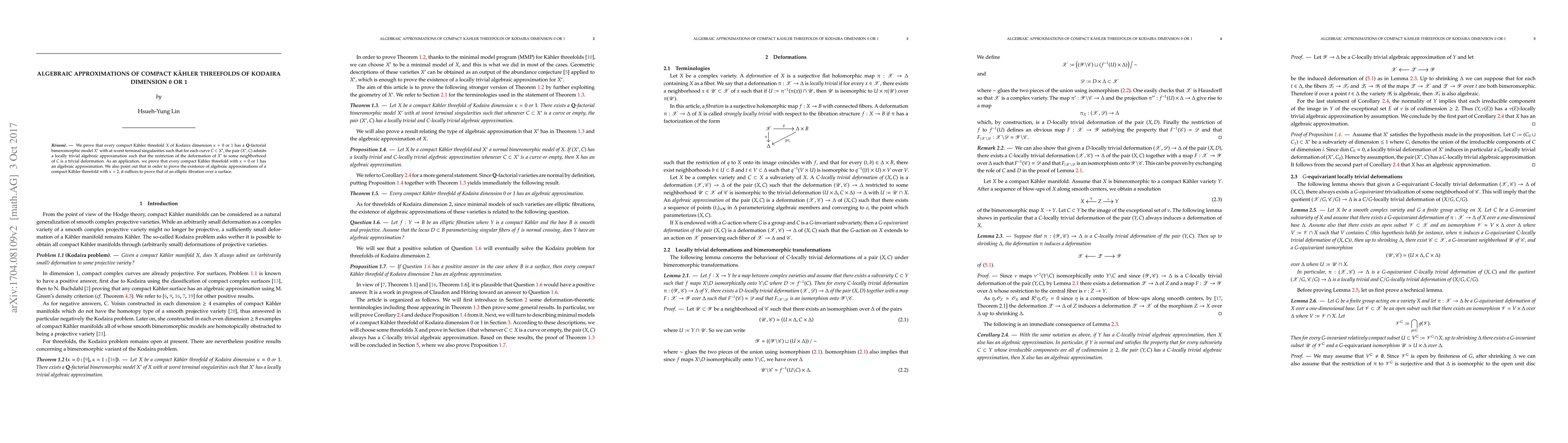 We prove that every compact K\"ahler threefold $X$ of Kodaira dimension $\kappa = 0$ or $1$ has a $\mathbf{Q}$-factorial bimeromorphic model $X'$ with at worst terminal singularities such that for each curve $C \subset X'$, the pair $(X',C)$ admits a locally trivial algebraic approximation such that the restriction of the deformation of $X'$ to some neighborhood of $C$ is a trivial deformation. As an application, we prove that every compact K\"ahler threefold with $\kappa = 0$ or $1$ has an algebraic approximation.