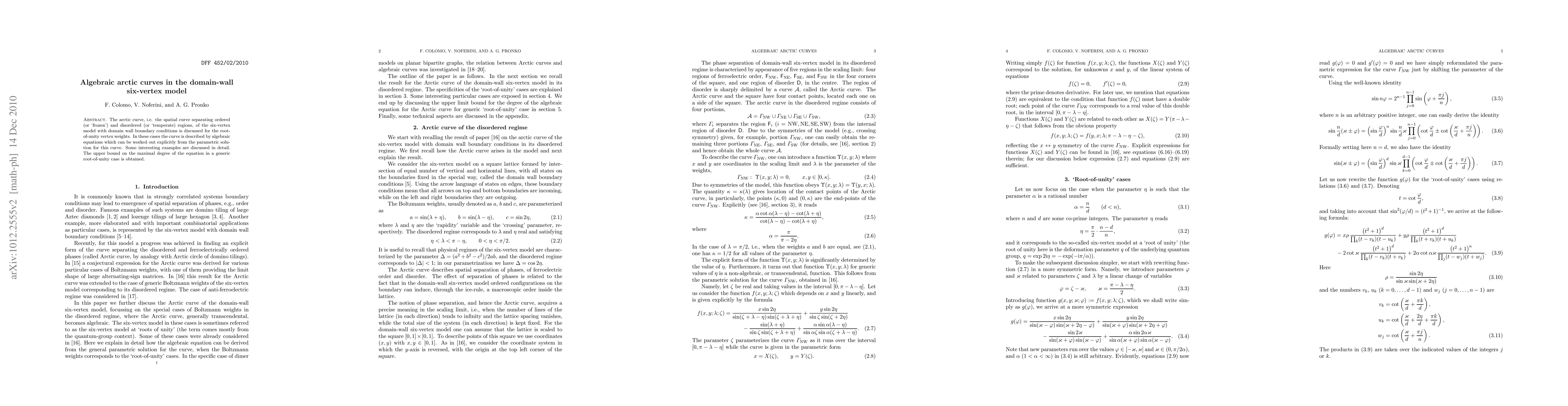 The arctic curve, i.e. the spatial curve separating ordered (or `frozen') and disordered (or `temperate) regions, of the six-vertex model with domain wall boundary conditions is discussed for the root-of-unity vertex weights. In these cases the curve is described by algebraic equations which can be worked out explicitly from the parametric solution for this curve. Some interesting examples are discussed in detail. The upper bound on the maximal degree of the equation in a generic root-of-unity case is obtained.