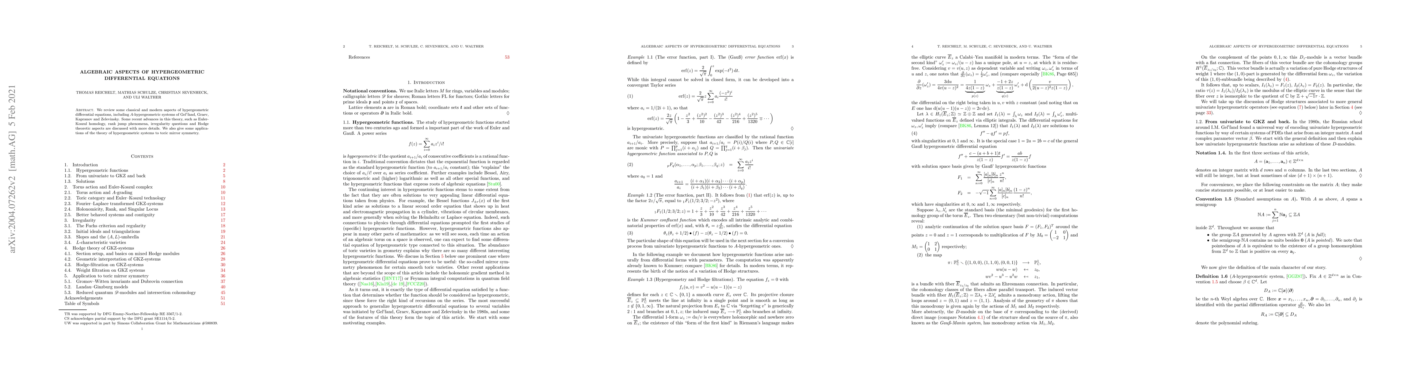 This paper reviews and advances the theory of hypergeometric differential equations, including recent developments in Euler-Koszul homology, rank jump phenomena, and applications to toric mirror symmetry, with implications for understanding algebraic structures.