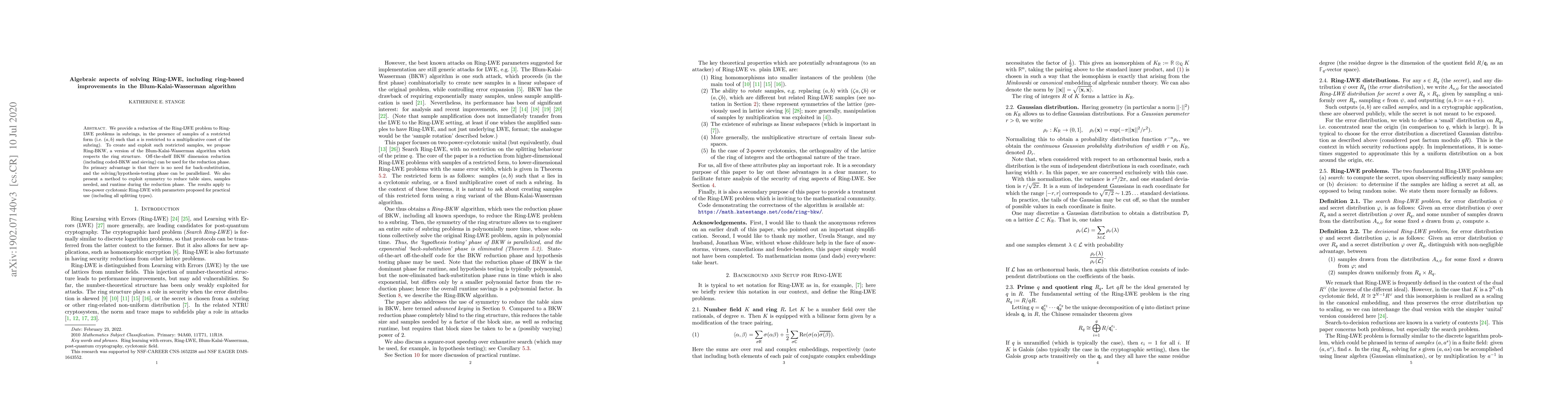 We provide a reduction of the Ring-LWE problem to Ring-LWE problems in subrings, in the presence of samples of a restricted form (i.e. $(a,b)$ such that $a$ is restricted to a multiplicative coset of the subring). To create and exploit such restricted samples, we propose Ring-BKW, a version of the Blum-Kalai-Wasserman algorithm which respects the ring structure. Off-the-shelf BKW dimension reduction (including coded-BKW and sieving) can be used for the reduction phase. Its primary advantage is that there is no need for back-substitution, and the solving/hypothesis-testing phase can be parallelized. We also present a method to exploit symmetry to reduce table sizes, samples needed, and runtime during the reduction phase. The results apply to two-power cyclotomic Ring-LWE with parameters proposed for practical use (including all splitting types).