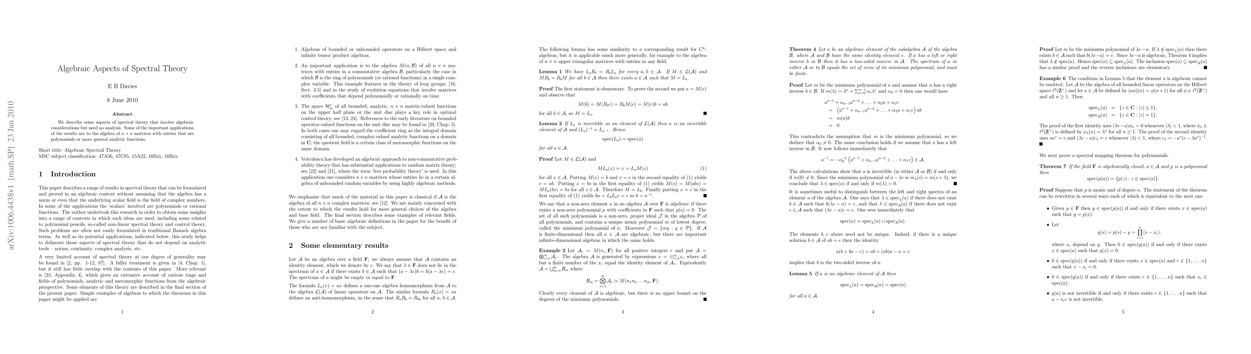 Summary: This paper explores algebraic facets of spectral theory without requiring analytical methods, focusing on applications to the algebra of $n\times n$ matrices with polynomial or analytic function entries. The results highlight the interplay between algebraic structures and spectral properties.