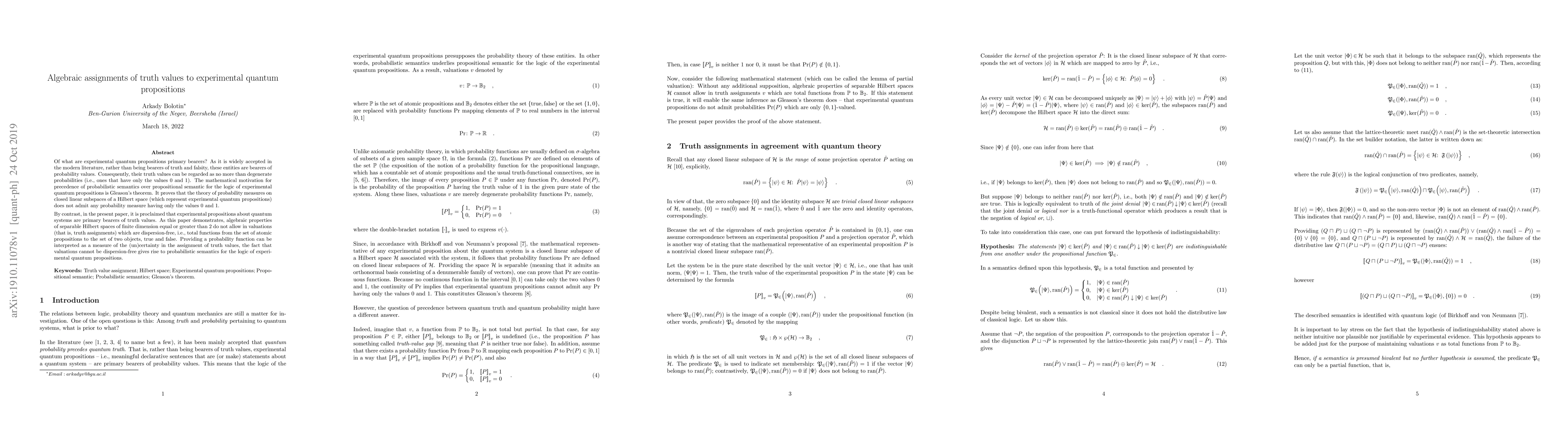 This paper argues that experimental quantum propositions are primary bearers of truth values rather than probability values, demonstrating that algebraic properties of separable Hilbert spaces do not support dispersion-free valuations. The conclusion posits that probabilistic semantics arise due to the impossibility of completely certain truth assignments.