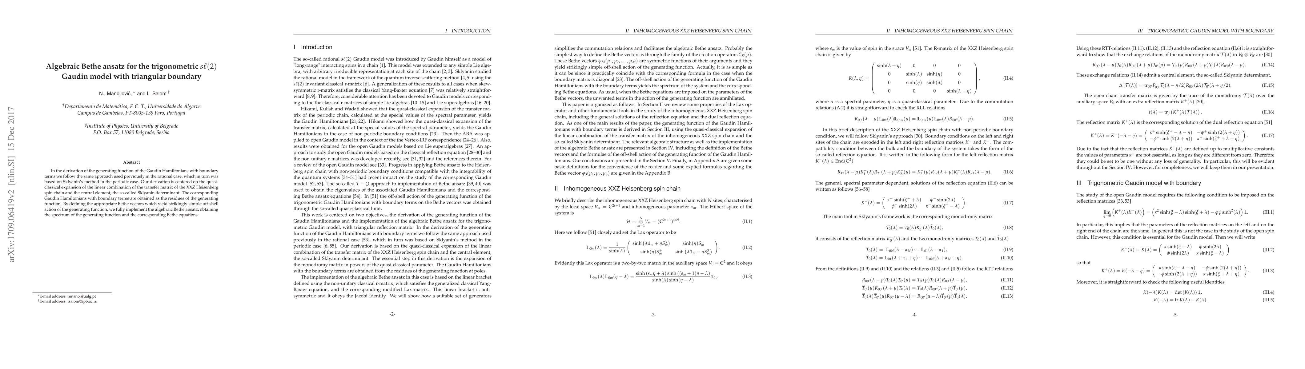 In the derivation of the generating function of the Gaudin Hamiltonians with boundary terms, we follow the same approach used previously in the rational case, which in turn was based on Sklyanin's method in the periodic case. Our derivation is centered on the quasi-classical expansion of the linear combination of the transfer matrix of the XXZ Heisenberg spin chain and the central element, the so-called Sklyanin determinant. The corresponding Gaudin Hamiltonians with boundary terms are obtained as the residues of the generating function. By defining the appropriate Bethe vectors which yield strikingly simple off-shell action of the generating function, we fully implement the algebraic Bethe ansatz, obtaining the spectrum of the generating function and the corresponding Bethe equations.