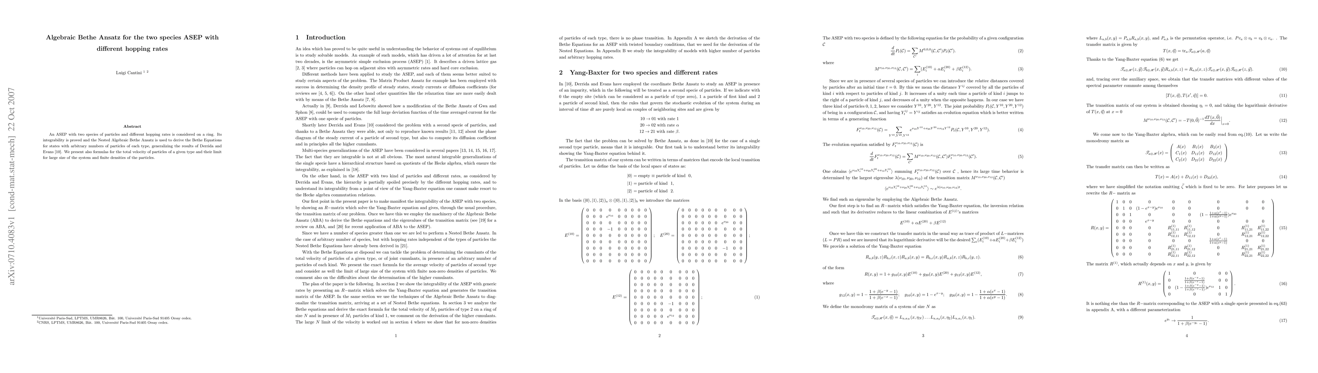 This paper proves the integrability of a two-species ASEP with different hopping rates on a ring and uses the Nested Algebraic Bethe Ansatz to derive Bethe Equations for states with arbitrary particle numbers. It also provides formulas for the total velocity of particles and their limits for large systems and finite densities.