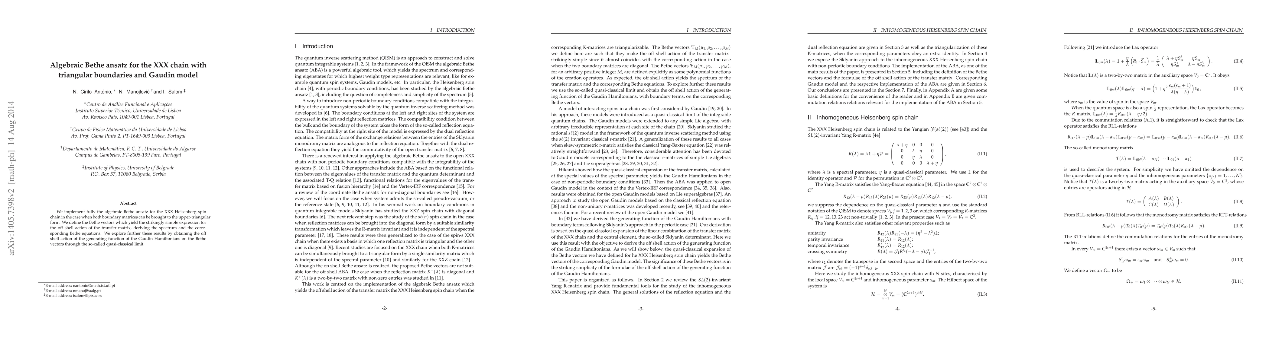This paper fully implements the algebraic Bethe ansatz for the XXX Heisenberg spin chain with triangular boundary conditions, deriving the spectrum and Bethe equations. It also explores the off-shell action of the transfer matrix and the Gaudin Hamiltonians in the quasi-classical limit.