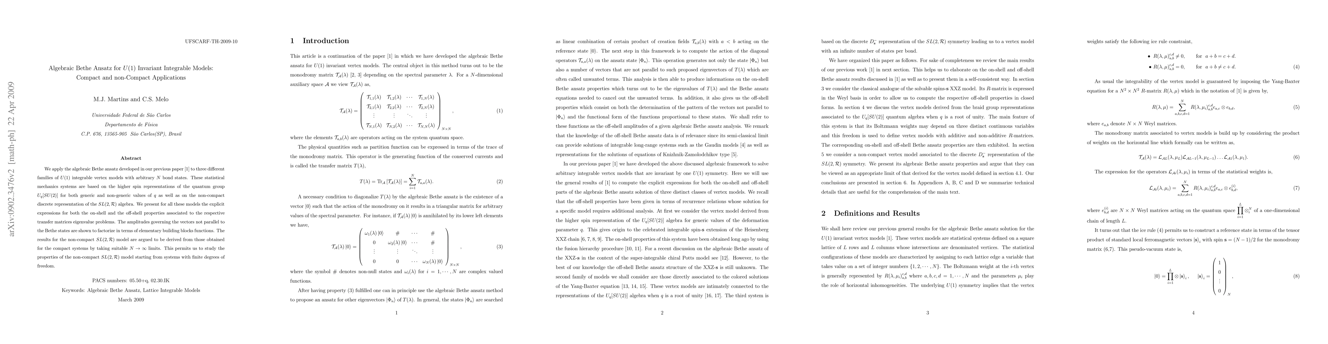 This paper applies the algebraic Bethe ansatz to U(1) invariant integrable vertex models, deriving explicit expressions for both on-shell and off-shell properties of transfer matrices. The results for non-compact $SL(2,{\cal R})$ models are derived from the compact systems by taking limits, allowing study of non-compact models from finite systems.