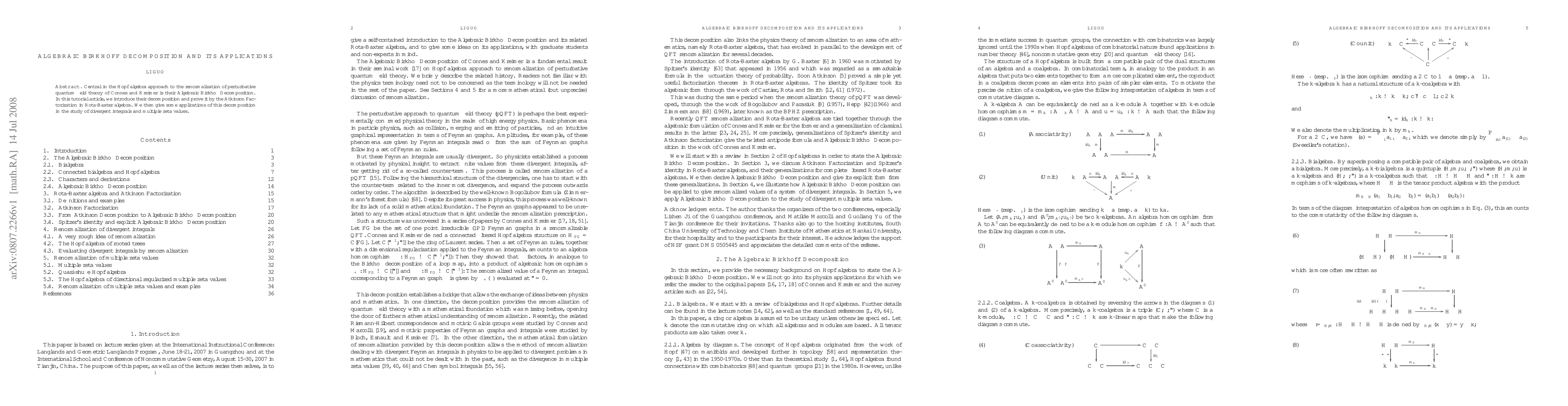 The paper introduces the Algebraic Birkhoff Decomposition crucial to Connes and Kreimer's Hopf algebra approach for quantum field theory renormalization, proving it via Atkinson Factorization in Rota-Baxter algebra, and demonstrates its applications in divergent integrals and multiple zeta values.