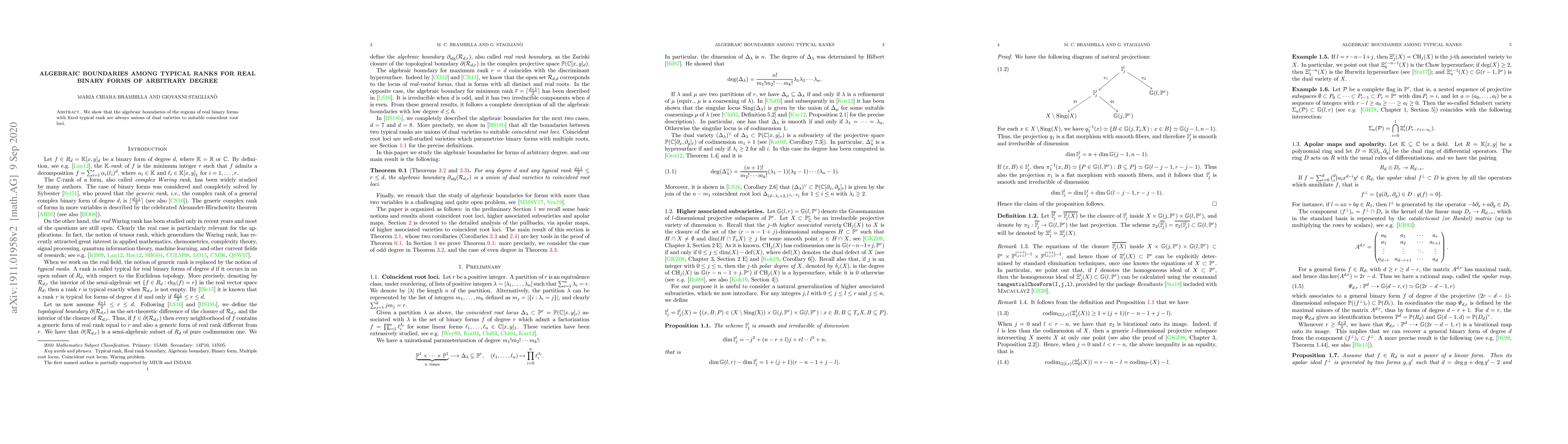 Two-line Summary: This paper demonstrates that the algebraic boundaries delineating regions of real binary forms with a fixed typical rank are composed of unions of dual varieties corresponding to coincident root loci. This provides a precise algebraic characterization of these boundaries.