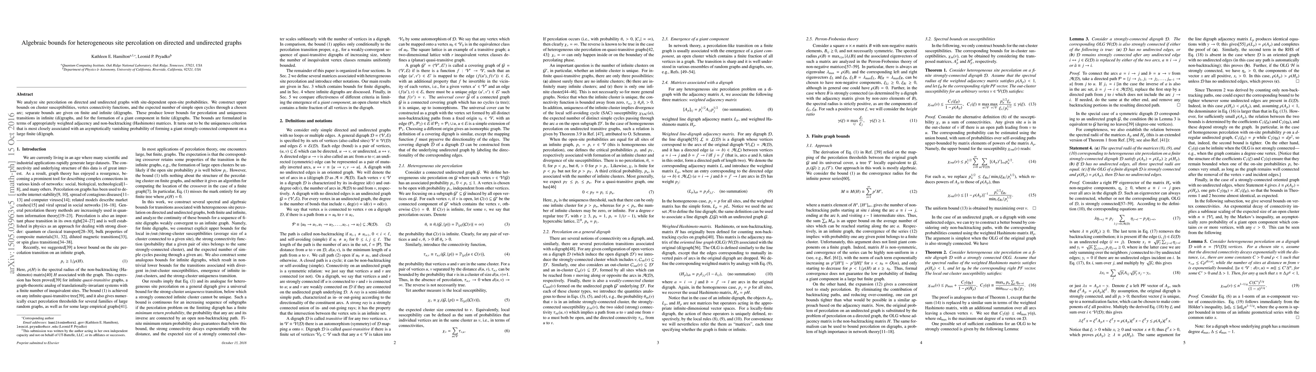 We analyze site percolation on directed and undirected graphs with site-dependent open-site probabilities. We construct upper bounds on cluster susceptibilities, vertex connectivity functions, and the expected number of simple open cycles through a chosen arc; separate bounds are given on finite and infinite (di)graphs. These produce lower bounds for percolation and uniqueness transitions in infinite (di)graphs, and for the formation of a giant component in finite (di)graphs. The bounds are formulated in terms of appropriately weighted adjacency and non-backtracking (Hashimoto) matrices. It turns out to be the uniqueness criterion that is most closely associated with an asymptotically vanishing probability of forming a giant strongly-connected component on a large finite (di)graph.