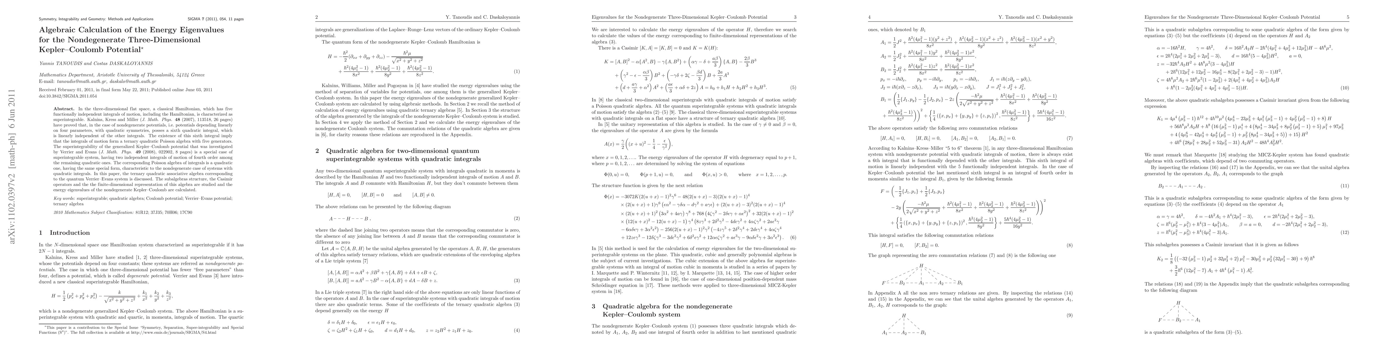 This paper explores the algebraic structure of the integrals of motion for the nondegenerate three-dimensional Kepler-Coulomb potential, proving its superintegrability and calculating the corresponding energy eigenvalues. It delves into the ternary quadratic Poisson algebra and its finite-dimensional representation, highlighting the existence of a sixth independent integral.