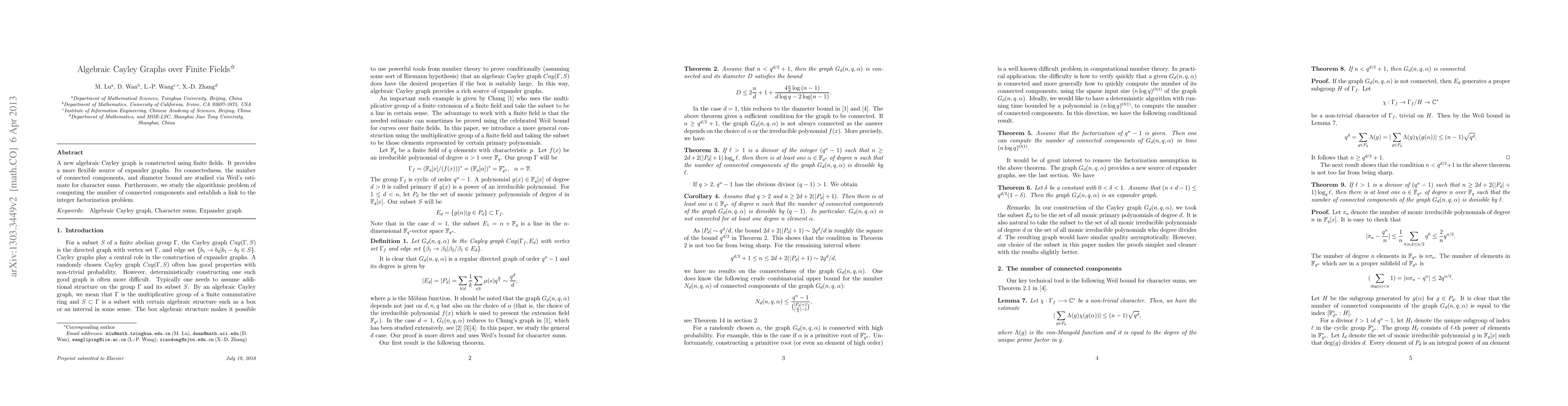 Summary: This paper constructs algebraic Cayley graphs over finite fields and analyzes their connectedness and diameter using Weil's character sum estimates, presenting them as a novel class of expander graphs that extend existing results.