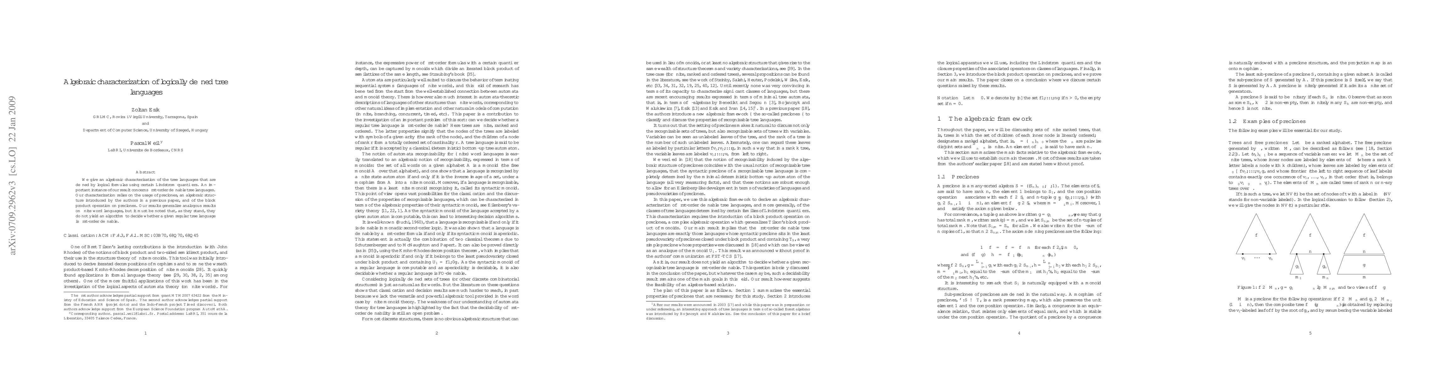 We give an algebraic characterization of the tree languages that are defined by logical formulas using certain Lindstr\"om quantifiers. An important instance of our result concerns first-order definable tree languages. Our characterization relies on the usage of preclones, an algebraic structure introduced by the authors in a previous paper, and of the block product operation on preclones. Our results generalize analogous results on finite word languages, but it must be noted that, as they stand, they do not yield an algorithm to decide whether a given regular tree language is first-order definable.