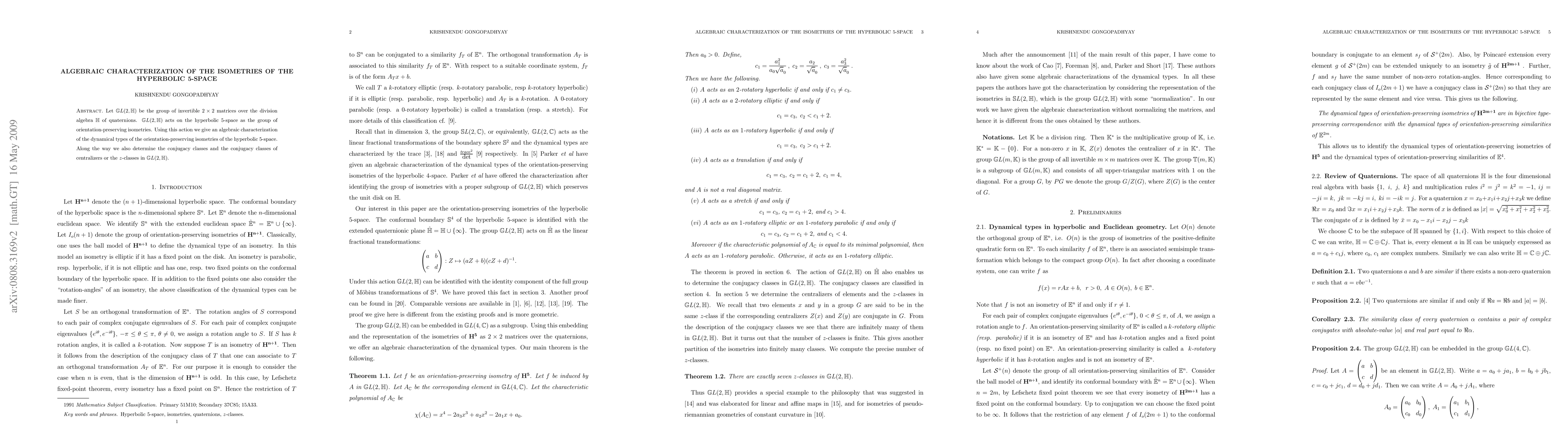 Using the representation of the isometries as 2x2 invertible matrices over the division algebra $\H$ of quaternions, we give an algebraic characterization of the dynamical types of the orientation-preserving isometries of the hyperbolic 5-space. We also determine the conjugacy classes and the conjugacy classes of centralizers or the z-classes in $GL(2, \H)$.