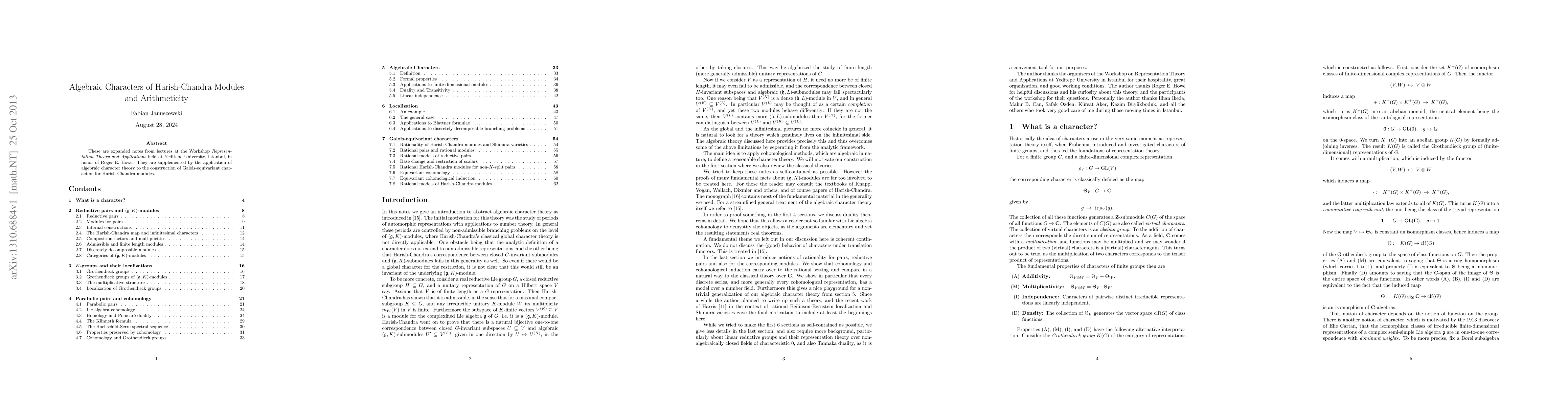 This paper discusses the application of algebraic character theory to the construction of Galois-equivariant characters for Harish-Chandra modules, expanding on lectures from a workshop in honor of Roger E. Howe. It explores the arithmeticity of these modules through their algebraic characters.