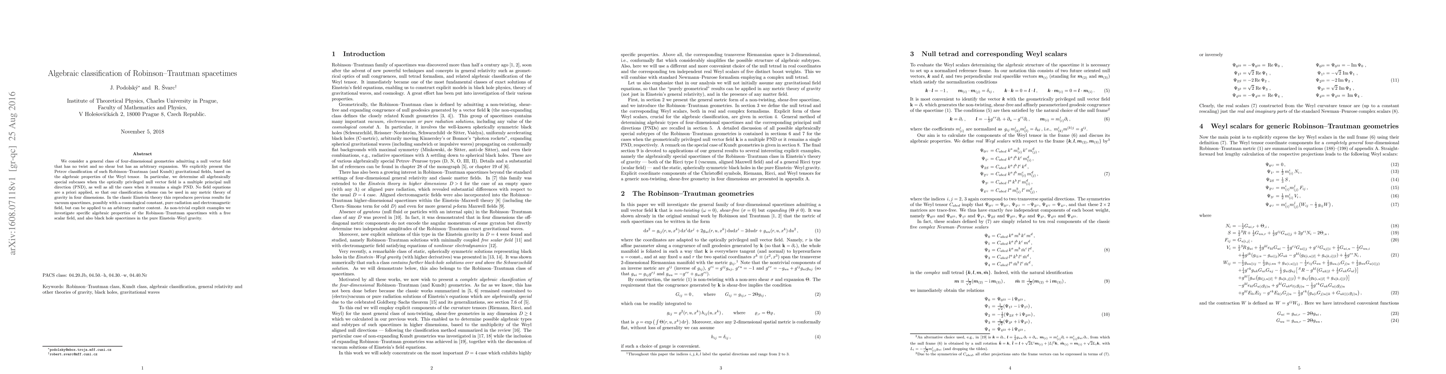 This paper provides an algebraic classification of Robinson-Trautman spacetimes, focusing on four-dimensional geometries with a null vector field without twist or shear. It determines the Petrov classification based on the Weyl tensor's algebraic properties, applicable to any metric theory of gravity.