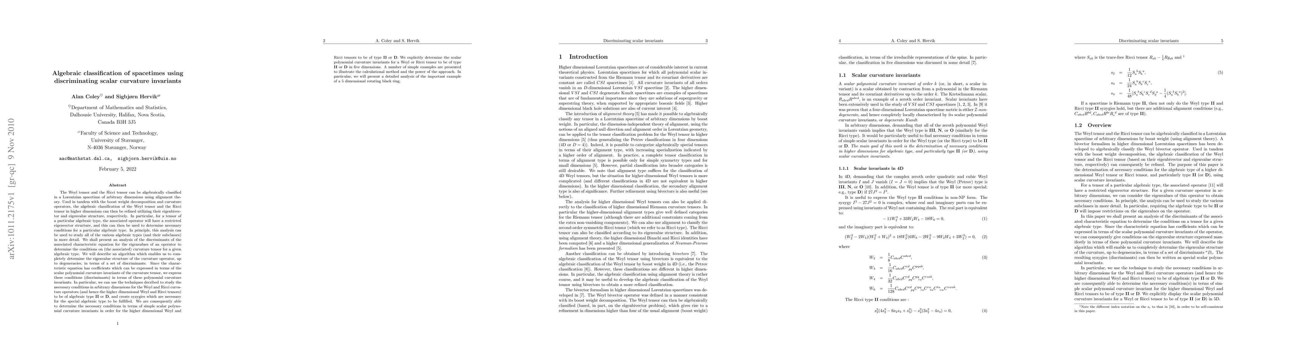 This paper develops an algebraic classification method for spacetimes using scalar curvature invariants, refining the classification of the Weyl and Ricci tensors in higher dimensions through discriminant analysis and curvature operator eigenvalue structures. It determines necessary conditions for tensors to be of algebraic type II or D, expressed in terms of simple scalar polynomial curvature invariants, with a detailed example of a 5D rotating black ring.