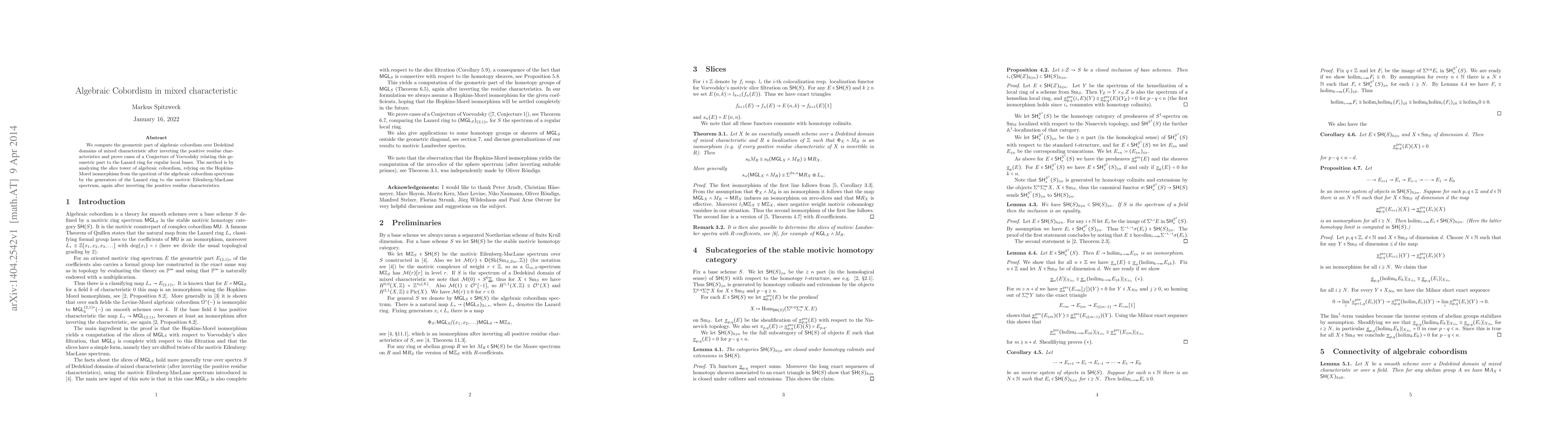 This paper computes the geometric part of algebraic cobordism over Dedekind domains of mixed characteristic, proving cases of a conjecture by Voevodsky. It uses the slice tower and Hopkins-Morel isomorphism to relate this part to the Lazard ring for regular local bases.