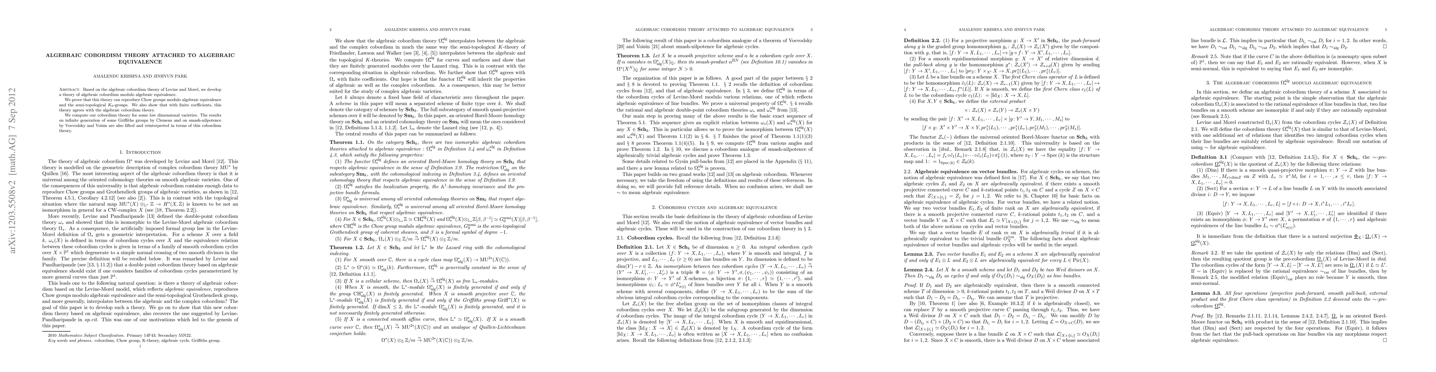 This paper develops algebraic cobordism theory based on Levine and Morel's framework, focusing on algebraic equivalence. It shows that this new theory reproduces Chow groups and semi-topological $K_0$-groups, and aligns with algebraic cobordism with finite coefficients.