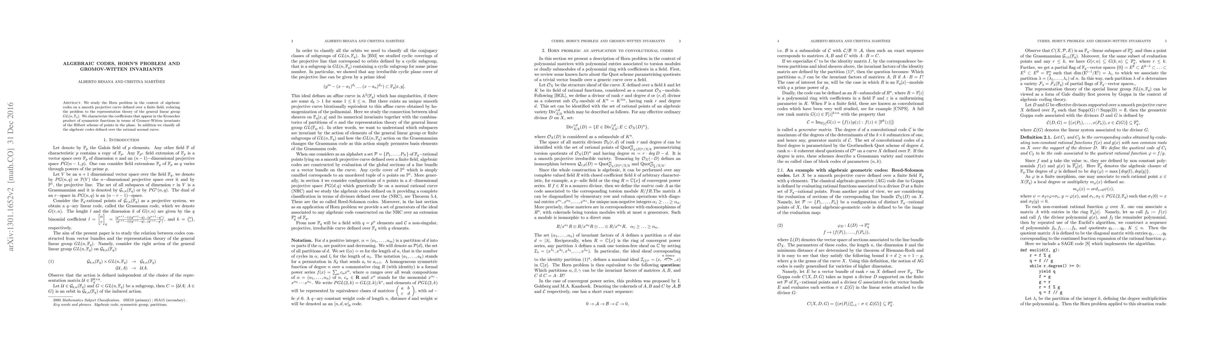 We study the Horn problem in the context of algebraic codes on a smooth projective curve defined over a finite field, reducing the problem to the representation theory of the special linear group $SL(2,F_q)$. We characterize the coefficients that appear in the Kronecker product of symmetric functions in terms of Gromov-Witten invariants of the Hilbert scheme of points in the plane. In addition we classify all the algebraic codes defined over the normal rational curve providing an algorithm to compute set of generators of the ideal associated to any algebraic code constructed on the NRC over an extension $\mathbb{F}_{q^{n}}$ of $\mathbb{F}_{q}$.