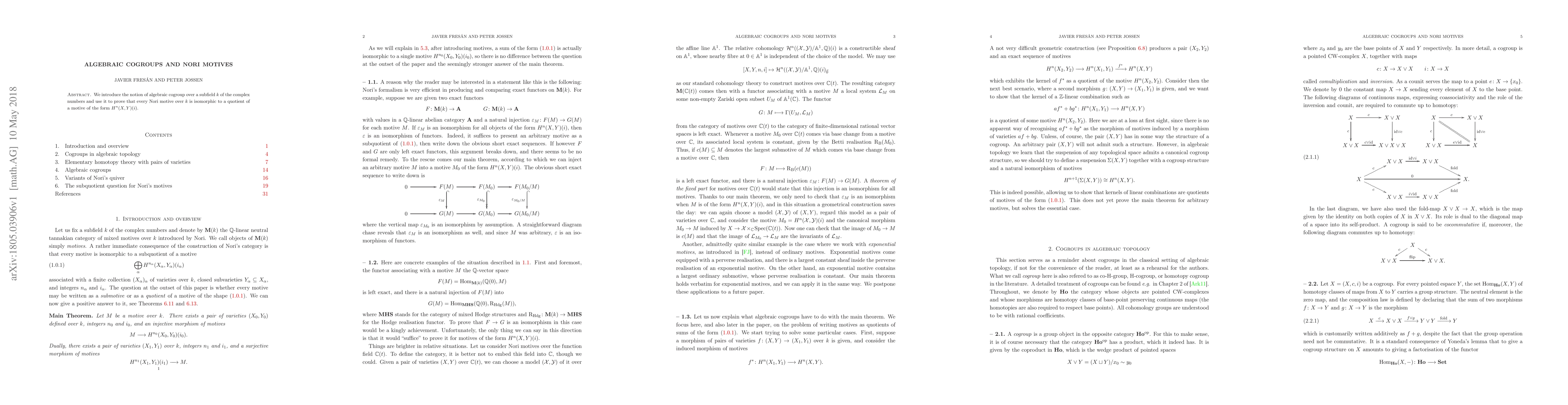 We introduce the notion of algebraic cogroup over a subfield $k$ of the complex numbers, and use it to prove that every Nori motive over $k$ is isomorphic to a quotient of a motive of the form $H^n(X, Y)(i)$.