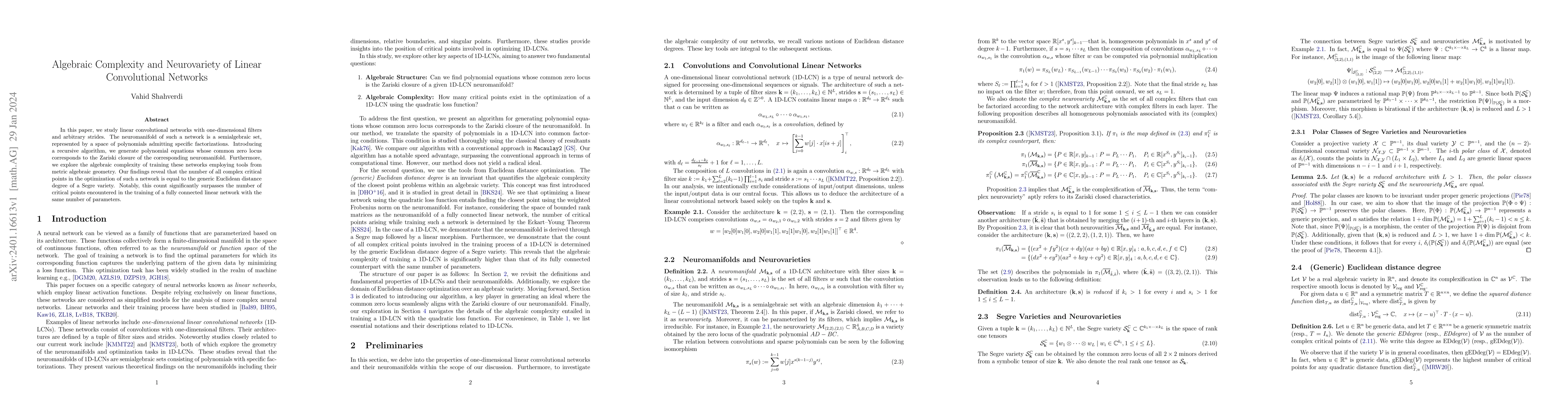 In this paper, we study linear convolutional networks with one-dimensional filters and arbitrary strides. The neuromanifold of such a network is a semialgebraic set, represented by a space of polynomials admitting specific factorizations. Introducing a recursive algorithm, we generate polynomial equations whose common zero locus corresponds to the Zariski closure of the corresponding neuromanifold. Furthermore, we explore the algebraic complexity of training these networks employing tools from metric algebraic geometry. Our findings reveal that the number of all complex critical points in the optimization of such a network is equal to the generic Euclidean distance degree of a Segre variety. Notably, this count significantly surpasses the number of critical points encountered in the training of a fully connected linear network with the same number of parameters.