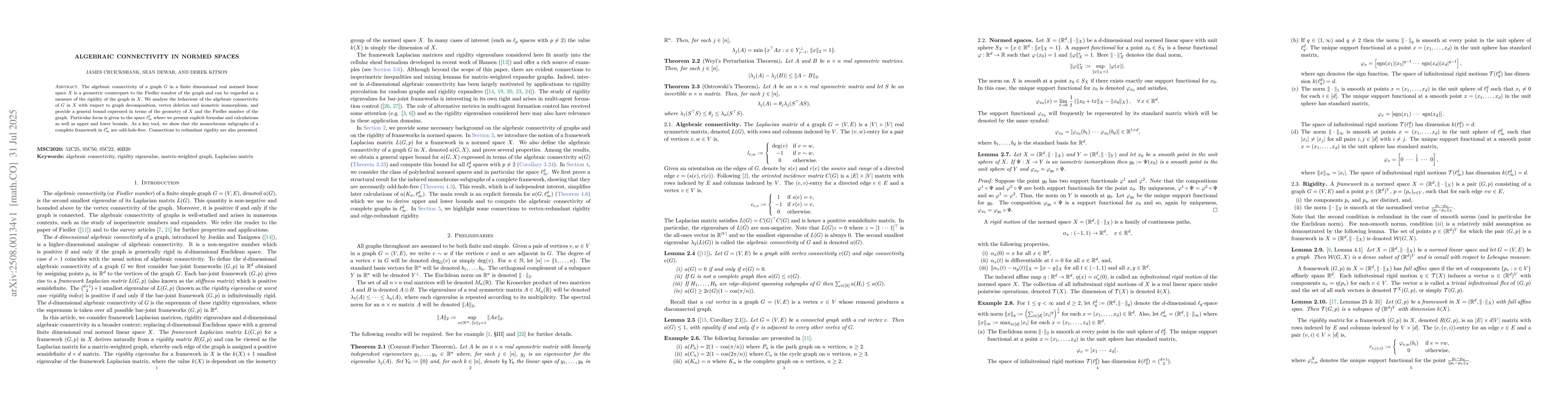 The algebraic connectivity of a graph $G$ in a finite dimensional real normed linear space $X$ is a geometric counterpart to the Fiedler number of the graph and can be regarded as a measure of the rigidity of the graph in $X$. We analyse the behaviour of the algebraic connectivity of $G$ in $X$ with respect to graph decomposition, vertex deletion and isometric isomorphism, and provide a general bound expressed in terms of the geometry of $X$ and the Fiedler number of the graph. Particular focus is given to the space $\ell_\infty^d$ where we present explicit formulae and calculations as well as upper and lower bounds. As a key tool, we show that the monochrome subgraphs of a complete framework in $\ell_\infty^d$ are odd-hole-free. Connections to redundant rigidity are also presented.