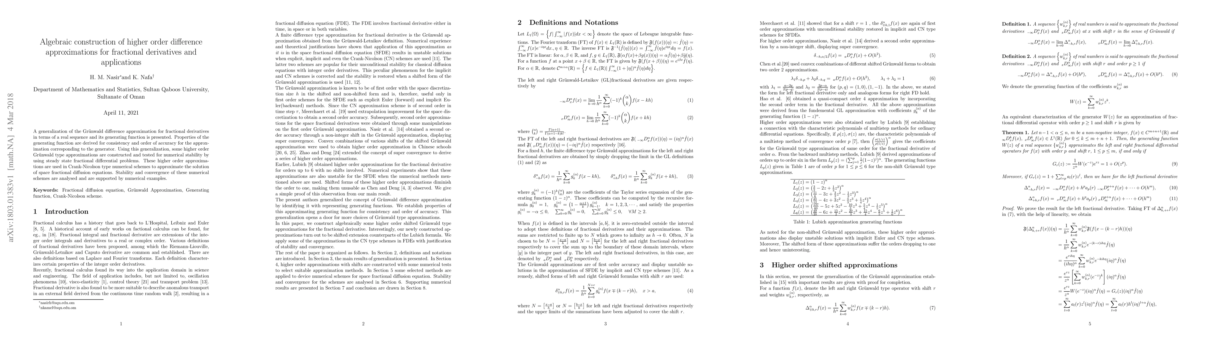 A generalization of the Gr\"{u}nwald difference approximation for fractional derivatives in terms of a real sequence and its generating function is presented. Properties of the generating function are derived for consistency and order of accuracy for the approximation corresponding to the generator. Using this generalization, some higher order Gr\"{u}nwald type approximations are constructed and tested for numerical stability by using steady state fractional differential problems. These higher order approximations are used in Crank-Nicolson type numerical schemes to approximate the solution of space fractional diffusion equations. Stability and convergence of these numerical schemes are analyzed and are supported by numerical examples.