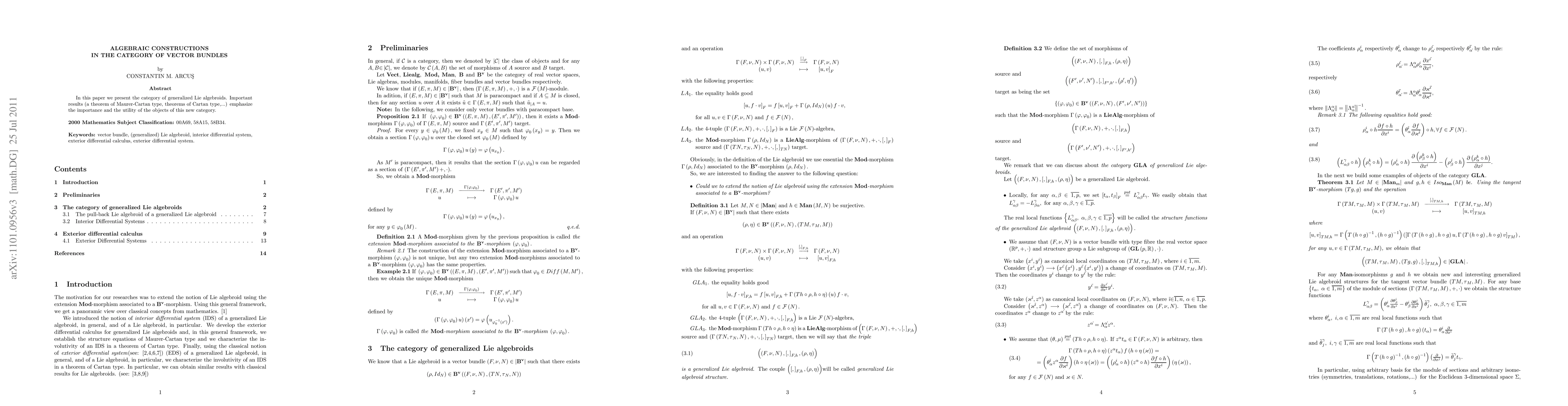 The category of generalized Lie algebroids is presented. We obtain an exterior differential calculus for generalized Lie algebroids. In particular, we obtain similar results with the classical and modern results for Lie algebroids. So, a new result of Maurer-Cartan type is presented. Supposing that any vector subbundle of the pullback vector bundle of a generalized Lie algebroid is called interior differential system (IDS) for that generalized Lie algebroid, a theorem of Cartan type is obtained. Extending the classical notion of exterior differential system (EDS) to generalized Lie algebroids, a theorem of Cartan type is obtained. Using the theory of linear connections of Ehresmann type presented in the paper [1], the identities of Cartan and Bianchi type are presented.
