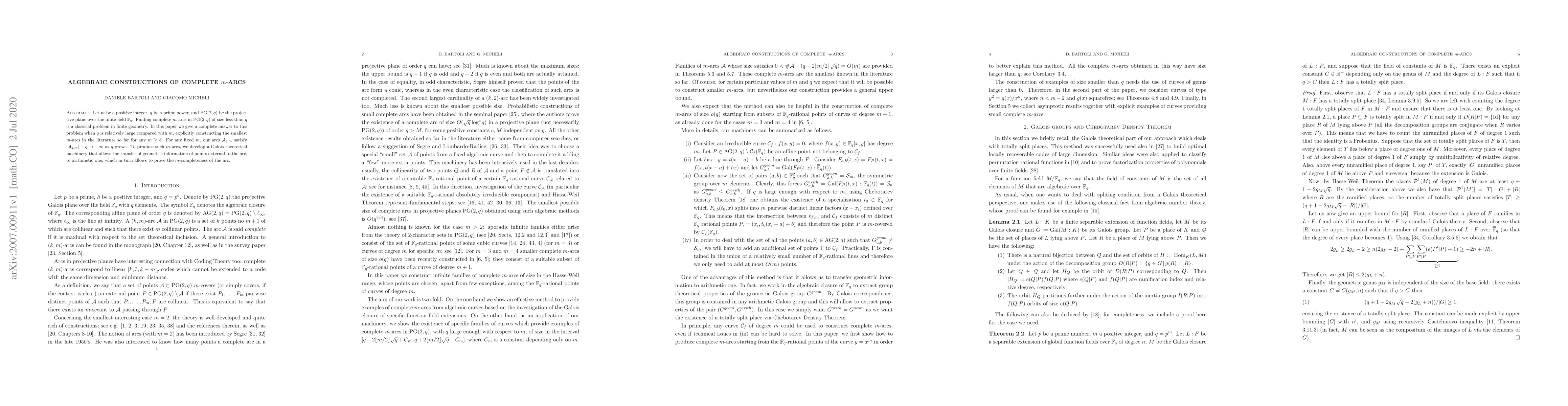 This paper constructs the smallest known complete $m$-arcs in projective planes $\mathrm{PG}(2,q)$ for $m \geq 8$, using Galois theoretical methods to transfer geometric information to arithmetic proofs of $m$-completeness as $q$ grows large relative to $m$.