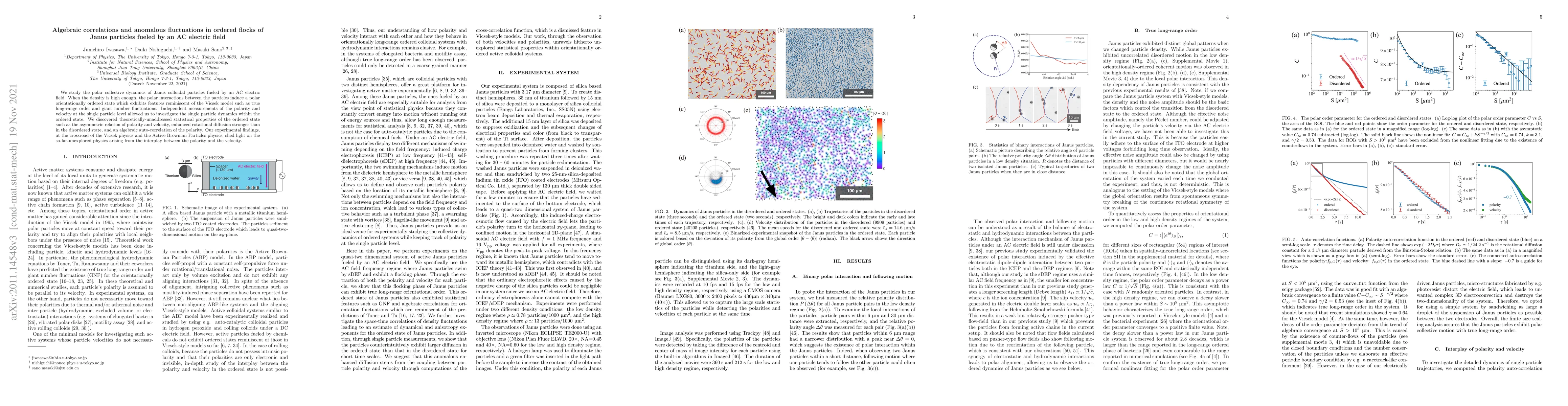 This paper investigates the collective dynamics of Janus particles driven by an AC electric field, revealing a polar ordered state with long-range order and anomalous fluctuations. It uncovers novel statistical properties, including an algebraic auto-correlation of polarity and enhanced rotational diffusion, providing new insights into the interplay between polarity and velocity in active matter systems.