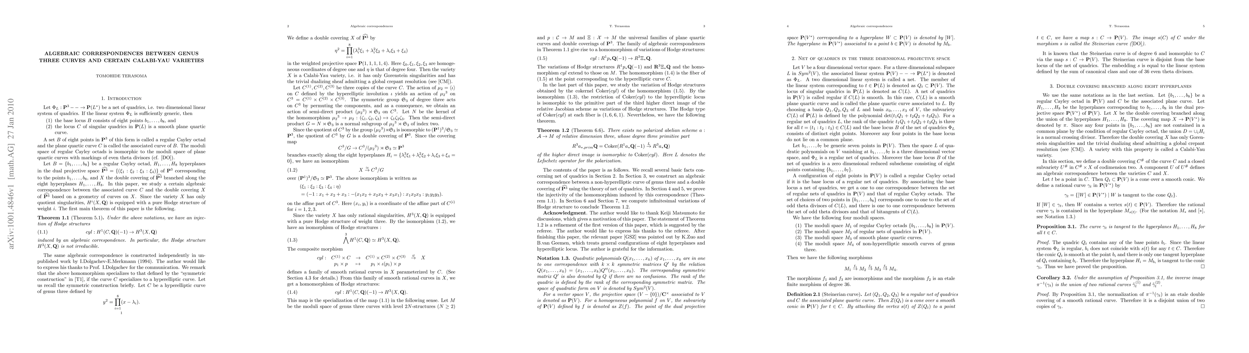 This paper constructs algebraic correspondences linking genus three curves to specific Calabi-Yau threefolds, embedding their first cohomology groups into the third cohomology of the Calabi-Yau varieties. It proves that the cokernel of this embedding cannot arise from variations of Hodge structures associated with polarized abelian schemes.