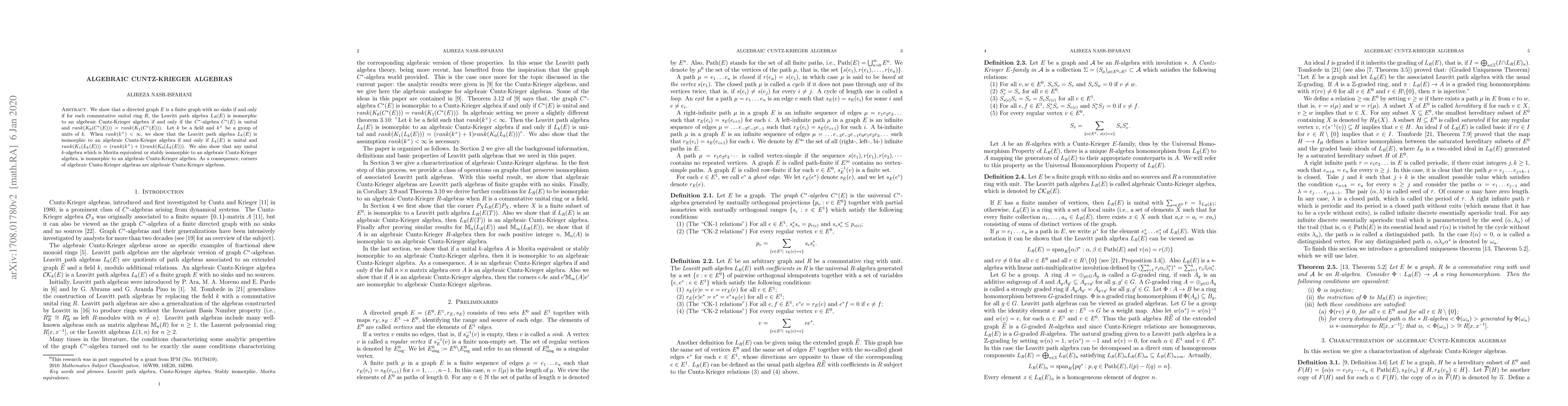 We show that $E$ is a finite graph with no sinks if and only if the Leavitt path algebra $L_R(E)$ is isomorphic to an algebraic Cuntz-Krieger algebra if and only if the $C^*$-algebra $C^*(E)$ is unital and $rank(K_0(C^*(E)))=rank(K_1(C^*(E)))$. When $k$ is a field and $rank(k^{\times})< \infty$, we show that the Leavitt path algebra $L_k(E)$ is isomorphic to an algebraic Cuntz-Krieger algebra if and only if $L_k(E)$ is unital and $rank(K_1(L_k(E)))=(rank(k^{\times})+1)rank(K_0(L_k(E)))$. We also show that any unital $k$-algebra which is Morita equivalent or stably isomorphic to an algebraic Cuntz-Krieger algebra, is isomorphic to an algebraic Cuntz-Krieger algebra. As a consequence, corners of algebraic Cuntz-Krieger algebras are algebraic Cuntz-Krieger algebras.