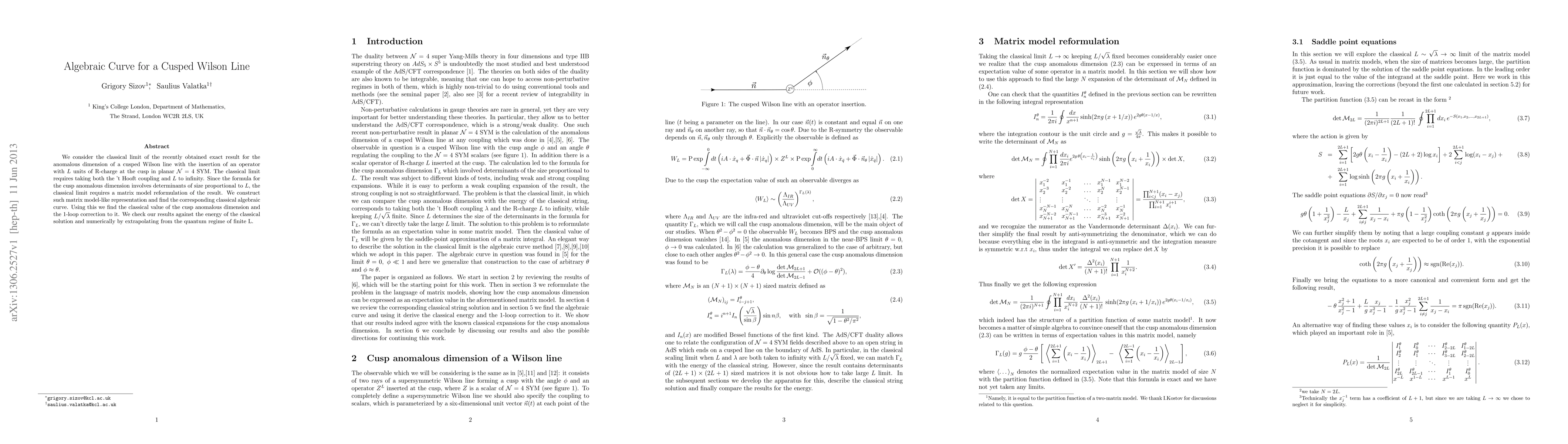 We consider the classical limit of the recently obtained exact result for the anomalous dimension of a cusped Wilson line with the insertion of an operator with L units of R-charge at the cusp in planar N=4 SYM. The classical limit requires taking both the 't Hooft coupling and L to infinity. Since the formula for the cusp anomalous dimension involves determinants of size proportional to L, the classical limit requires a matrix model reformulation of the result. We construct such matrix model-like representation and find corresponding classical algebraic curve. Using this we derive the classical value of the cusp anomalous dimension and the 1-loop correction to it. We check our results against the energy of the classical solution and numerically by extrapolating from the quantum regime of finite L.