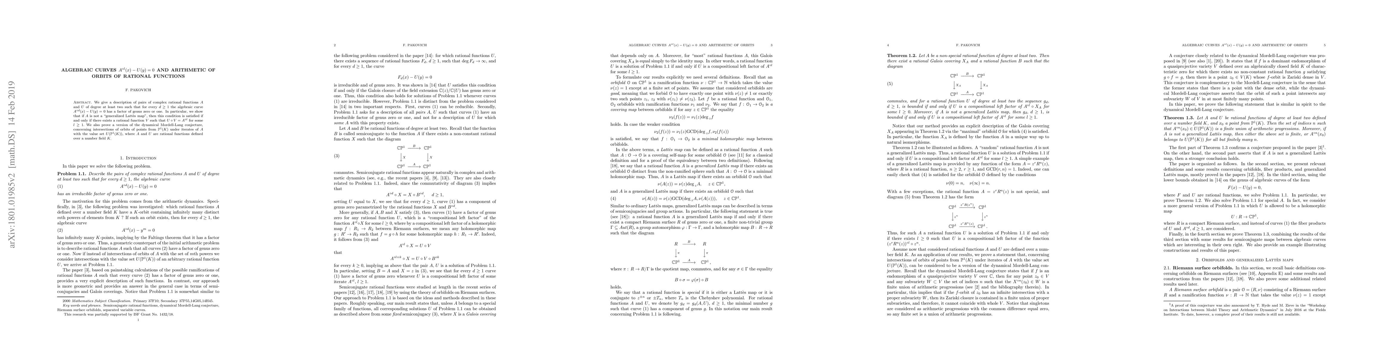 We give a description of pairs of complex rational functions $A$ and $U$ of degree at least two such that for every $d\geq 1$ the algebraic curve $A^{\circ d}(x)-U(y)=0$ has a factor of genus zero or one. In particular, we show that if $A$ is not a `generalized Latt\`es map', then this condition is satisfied if and only if there exists a rational function $V$ such that $U\circ V=A^{\circ l}$ for some $l\geq 1.$ We also prove a version of the dynamical Mordell-Lang conjecture, concerning intersections of orbits of points from $\mathbb P^1(K)$ under iterates of $A$ with the value set $U(\mathbb P^1(K))$, where $A$ and $U$ are rational functions defined over a number field $K.$
