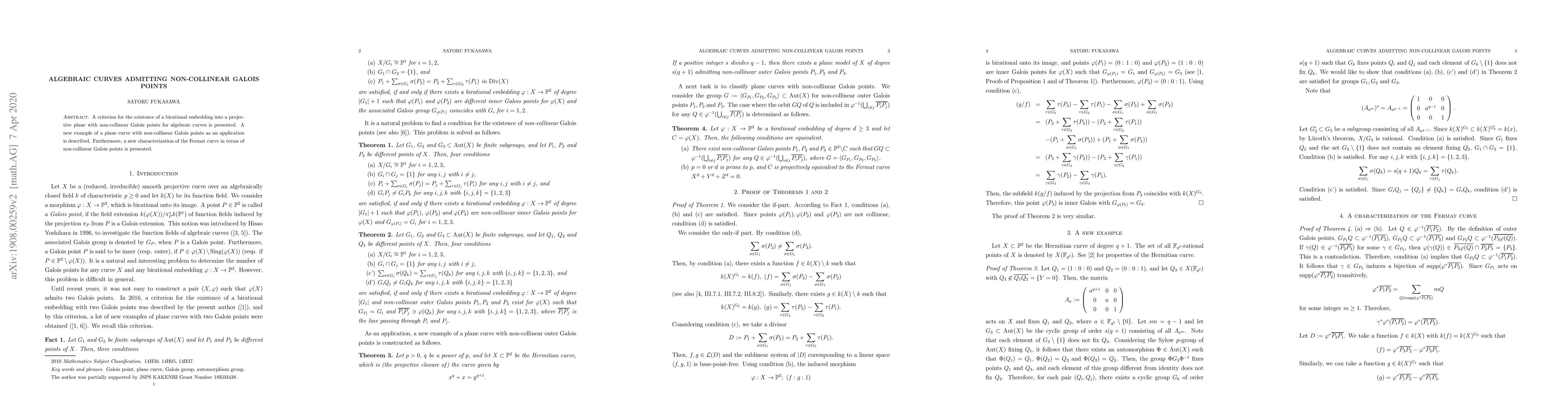 A criterion for the existence of a birational embedding into a projective plane with non-collinear Galois points for algebraic curves is presented. A new example of a plane curve with non-collinear Galois points as an application is described. Furthermore, a new characterization of the Fermat curve in terms of non-collinear Galois points is presented.