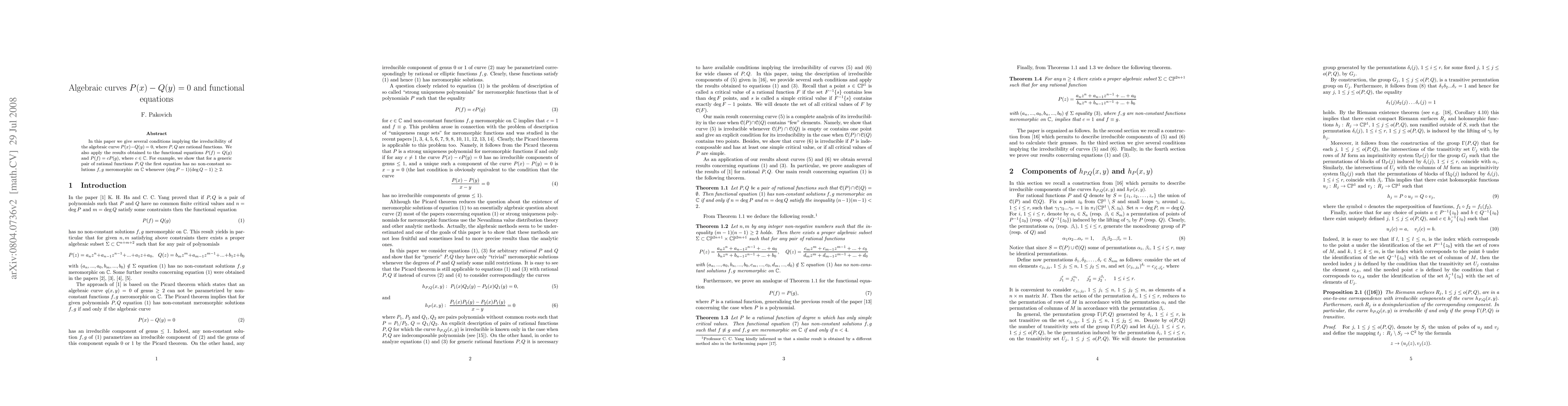 This paper establishes conditions for the irreducibility of the algebraic curve defined by P(x)-Q(y)=0, where P and Q are rational functions. It also explores the implications for functional equations P(f)=Q(g) and P(f)=cP(g), proving that for generic rational functions P and Q, the first equation has no non-constant meromorphic solutions when (\deg P-1)(\deg Q-1) ≥ 2.
