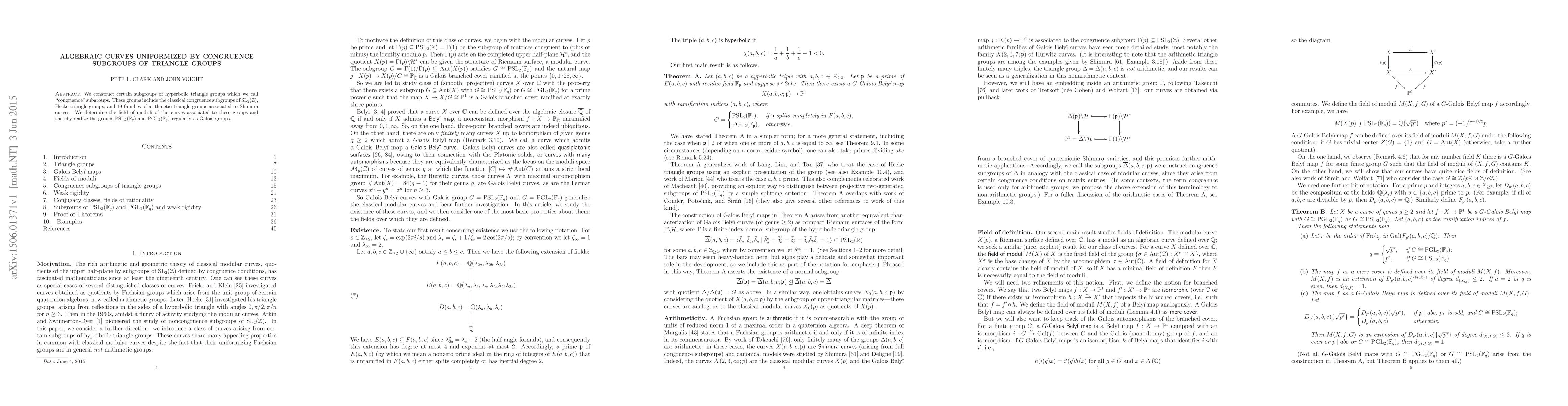 This paper constructs congruence subgroups of hyperbolic triangle groups, including classical SL_2(ZZ) subgroups and 19 families of arithmetic triangle groups. It determines the moduli fields of associated curves, realizing PSL_2(q) and PGL_2(q) as Galois groups.