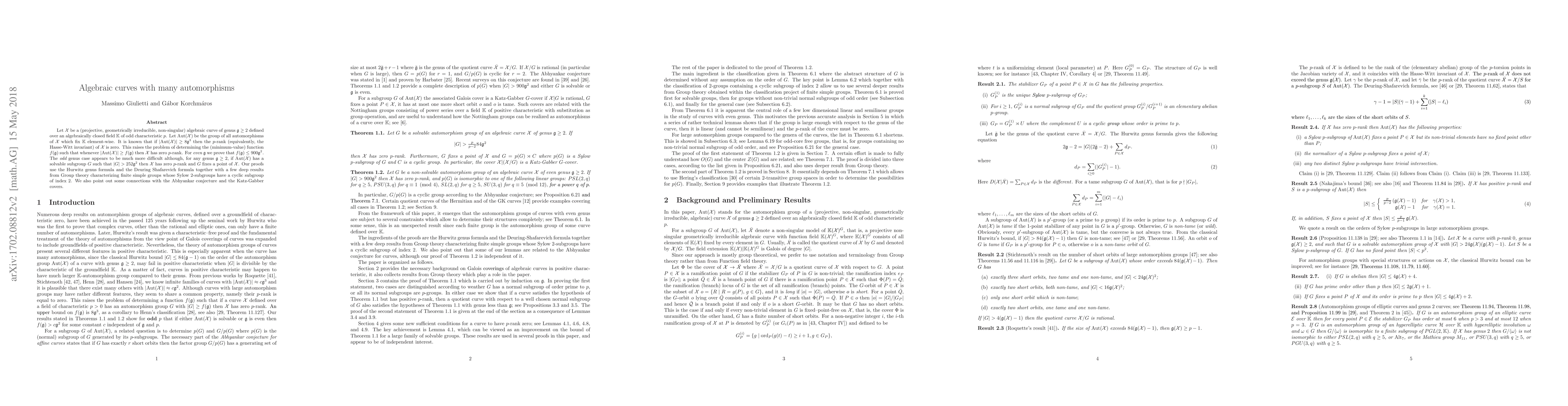 The paper introduces and proves a bound on the order of automorphism groups of even genus algebraic curves over fields of odd characteristic, linking this to the p-rank of the curve.
