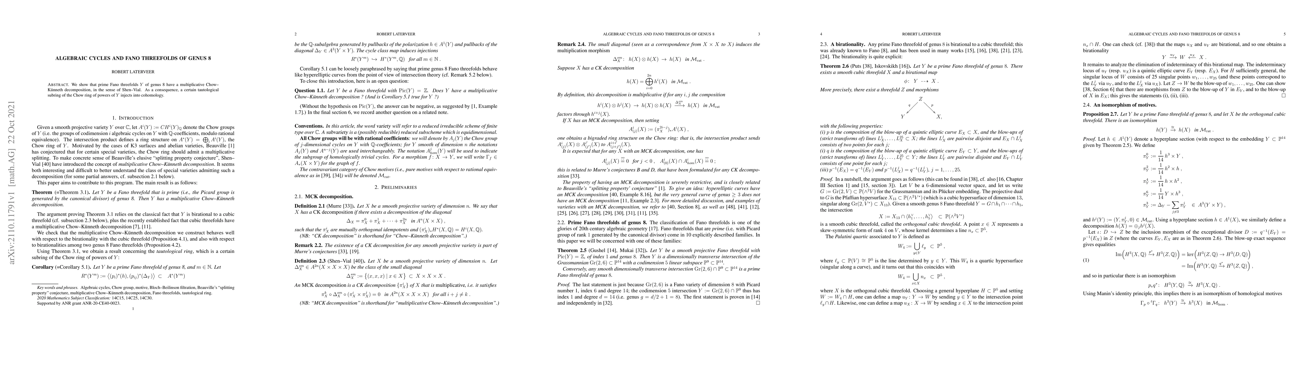 Summary: This paper demonstrates that prime Fano threefolds of genus 8 exhibit a multiplicative Chow-Künneth decomposition, leading to an injection of a specific tautological subring into cohomology.
