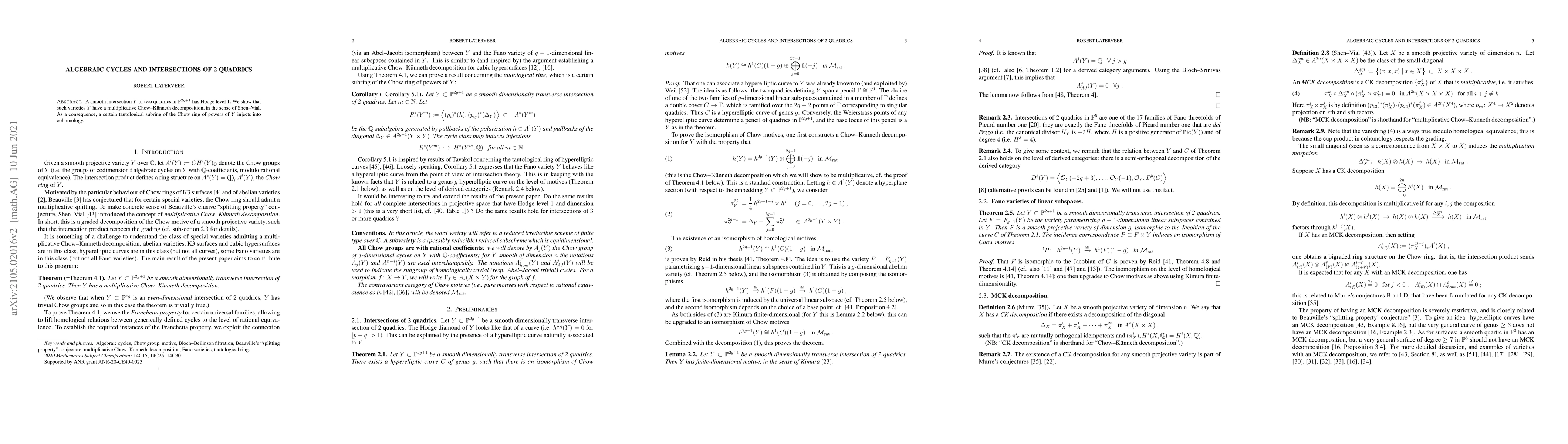 This paper demonstrates that smooth intersections of two quadrics in projective space exhibit Hodge level 1 and possess a multiplicative Chow-Künneth decomposition, leading to an injective map from a tautological subring in the Chow ring of their powers into cohomology.