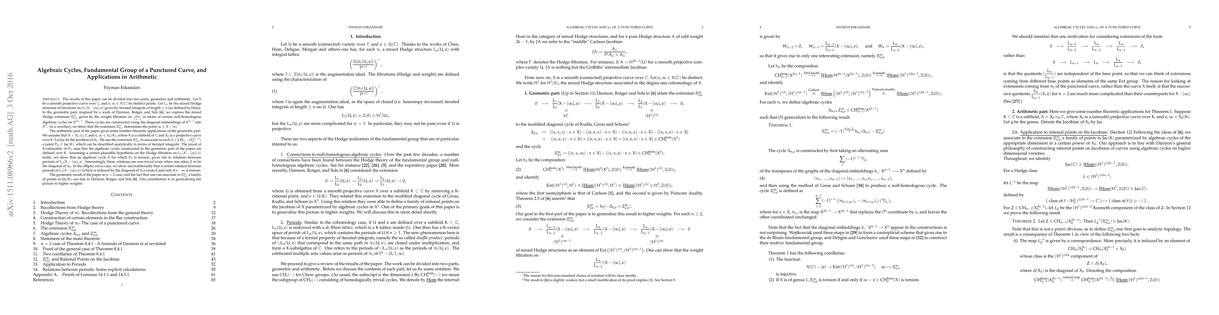 This paper explores the connection between algebraic cycles on punctured curves, the fundamental group, and their arithmetic applications. It establishes a mixed Hodge structure on the fundamental group and relates it to algebraic cycles, showing that these cycles determine specific points on the curve. The arithmetic part uses these connections to derive number-theoretic results, including associating algebraic cycles to torsion points in the Jacobian, with implications for relations between periods of the fundamental group.
